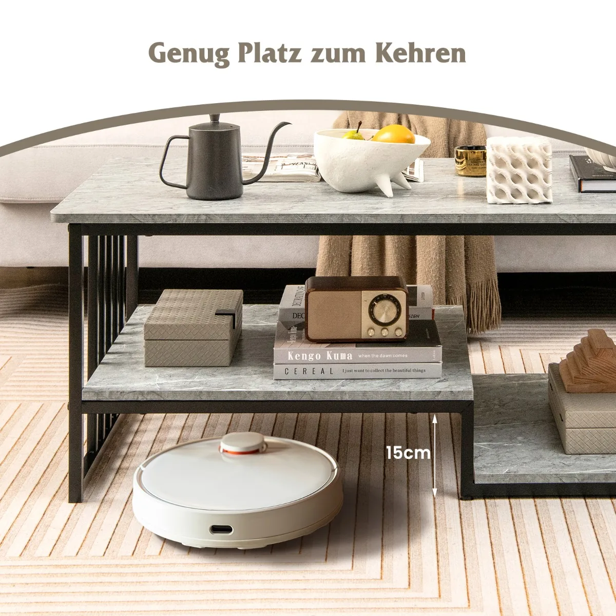 Kavos staliukas 110x60x45cm pilkos ir juodos spalvos puikiai tiks tiek namų, tiek biuro interjere. Staliuko dirbtinio marmuro stalviršis ir tvirtas juodos spalvos metalinis rėmas užtikrina stabilumą bei ilgaamžiškumą. Dėl erdvių atvirų lentynų galite patogiai laikyti ir eksponuoti įvairius daiktus.