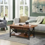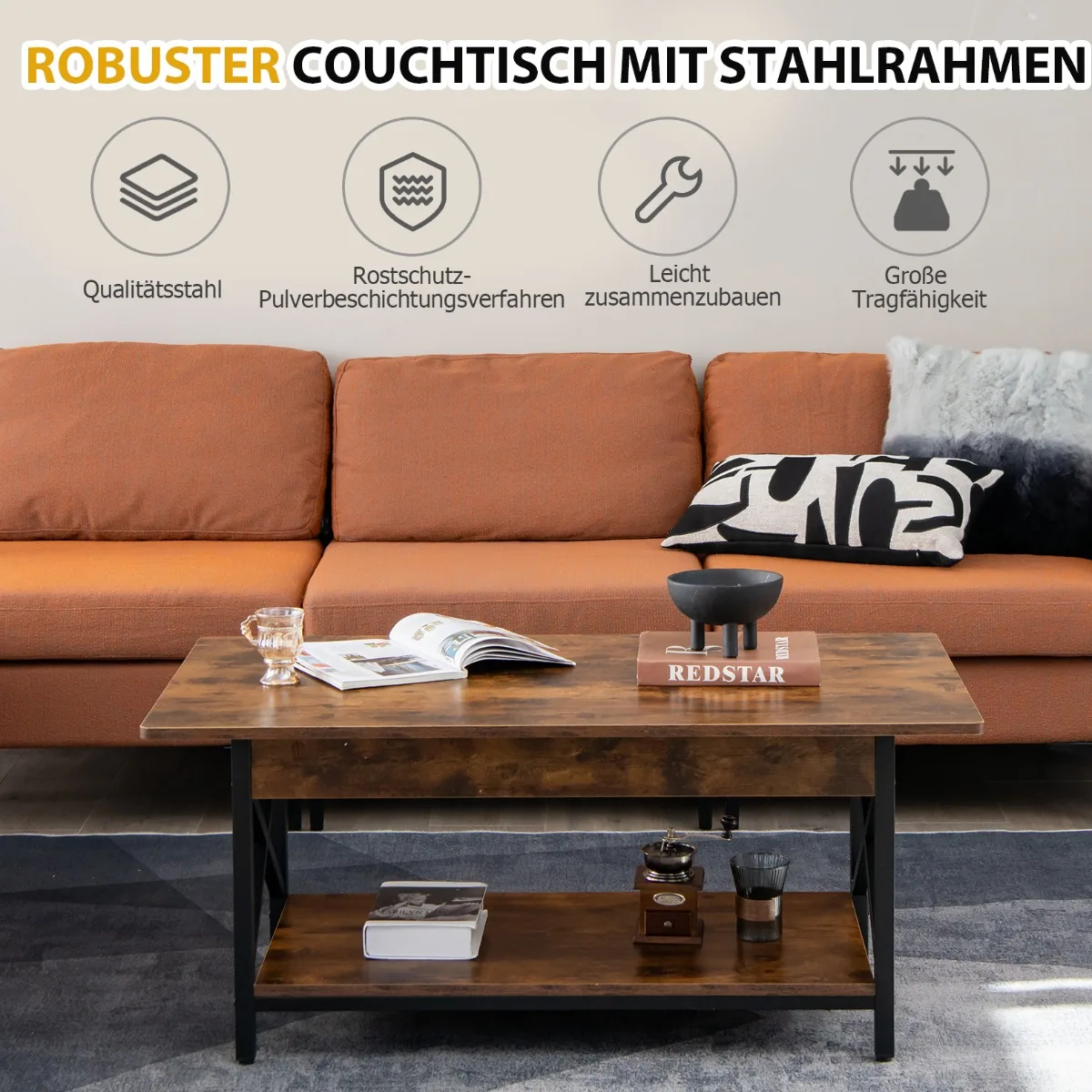 Kavos staliukas 110x60x48 cm, rudos ir juodos spalvos, yra praktiškas sprendimas svetainės ar poilsio kambario interjerui. Tvirta metalinė konstrukcija ir medinė stalviršio plokštė suteikia stabilumą, o dviejų sluoksnių dizainas užtikrina papildomą vietą daiktams laikyti.