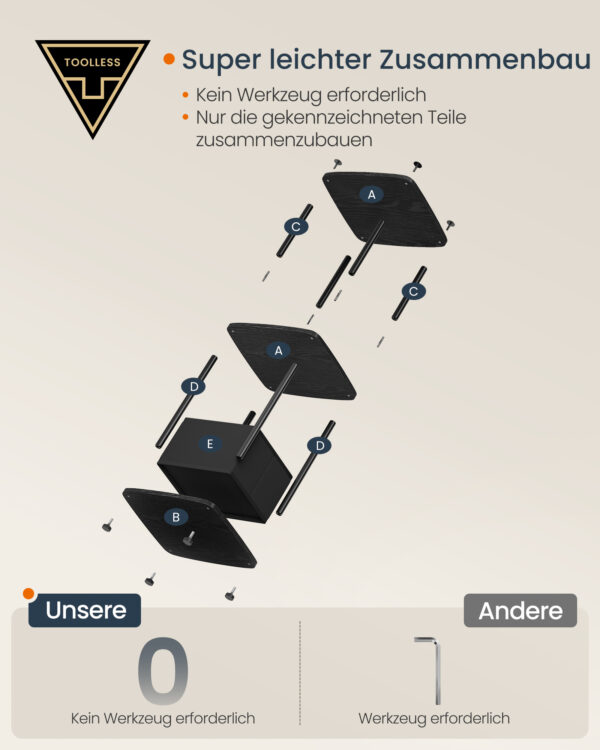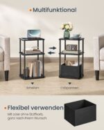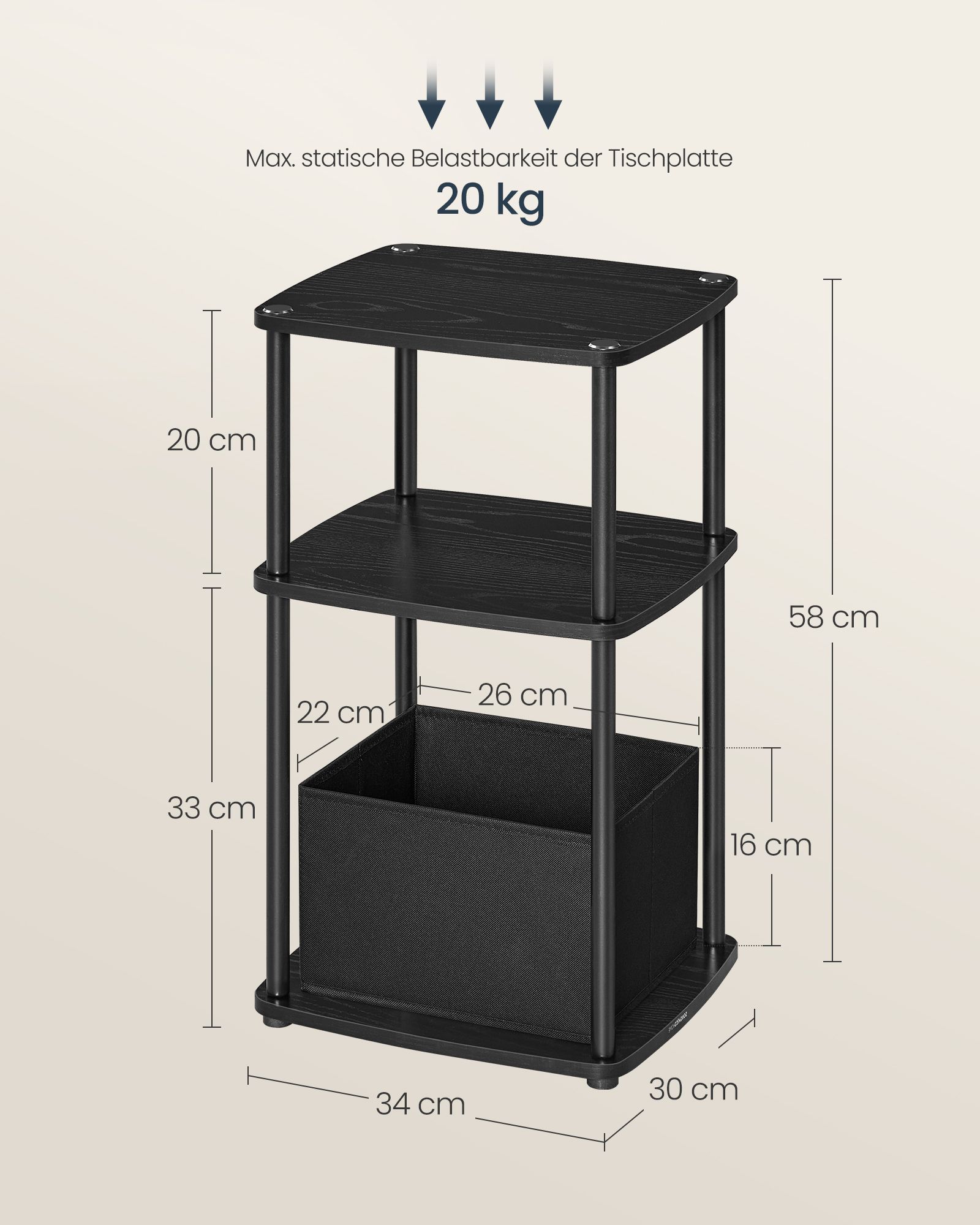 Pagamintas iš aukštos kokybės medžio drožlių plokštės, plieno ir Oksfordo audinio, šis staliukas yra tvirtas ir ilgaamžis. Audinio krepšelio dydis yra 22 x 26 x 16 cm, o bendras svoris siekia 3,7 kg.