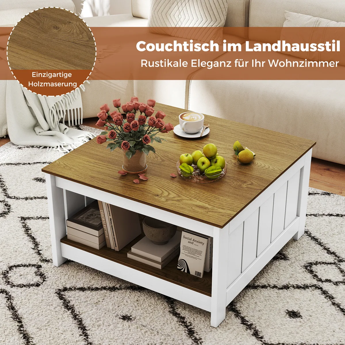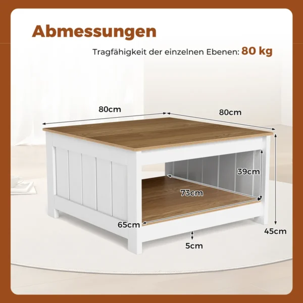 Kavos staliukas 80x80x45 cm, baltos ir šviesiai rudos spalvos, puikiai tinka gyvenamųjų kambarių, namų biurų ar priėmimo zonų erdvėms. Dviejų pakopų dizainas su plačiu stalviršiu ir atvira lentyna leidžia patogiai laikyti įvairius daiktus. Tvirta konstrukcija užtikrina patikimumą kasdienėje naudojimo aplinkoje.