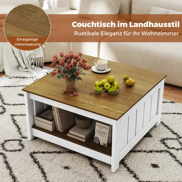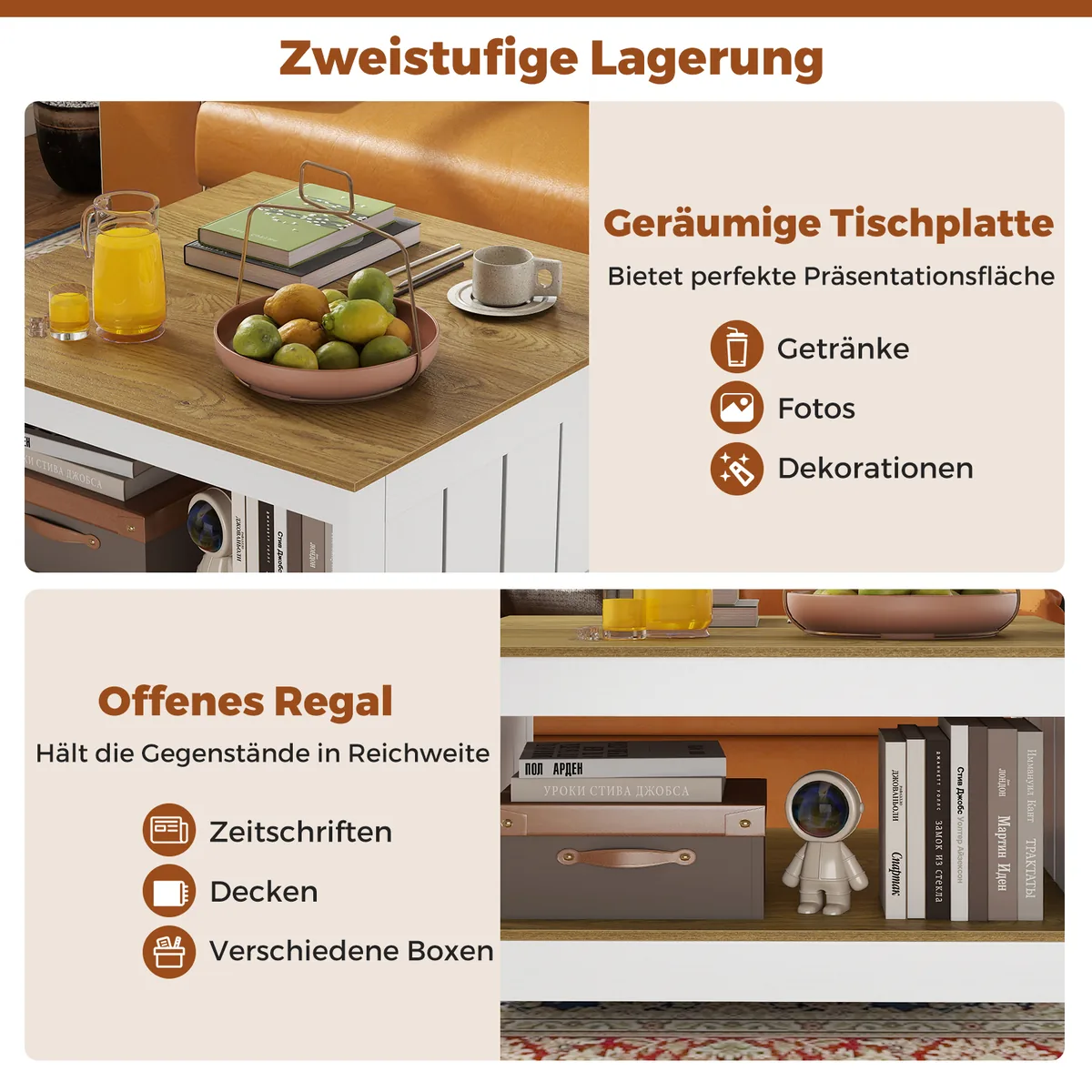 - Dviejų pakopų kavos staliukas su plačiu stalviršiu ir atvira apatine lentyna įvairiems daiktams laikyti.