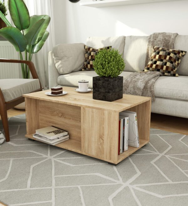 Ąžuolinis kavos staliukas „Sonoma“ yra sėkmingas funkcionalumo, vizualinio patrauklumo ir elegantiškos apdailos derinys. Dėl universalių, šiltų spalvų stalas puikiai tiks tiek šiuolaikiniame, tiek tradiciniame interjere. Mažas baldų dydis reiškia, kad suoliuką galima pastatyti ne tik didelėje gyvenamajame kambaryje daugiabučiame name, bet ir mažoje daugiabučio gyvenamojo namo patalpoje. Baldai yra universalūs. Jis gali būti naudojamas ne tik priimant svečius ir atsigeriant kavos ar arbatos, bet ir kaip vieta poilsiui su knyga, laikraščiu ar darbui su nešiojamu kompiuteriu. Svetainės suoliukas turi patogias, funkcionalias ir gilias lentynas po stalviršiu, kurios gali būti sėkmingai naudojamos žurnalams, kompaktiniams diskams ar kompiuterių priedams. 90 cm kavos staliukas pagamintas iš aukštos kokybės laminuotos plokštės, kurių kraštai apdailinti dizainerių kurtais ABS kraštais. Plokštė atspari trinčiai, užliejimui ir mechaniniams pažeidimams, todėl nepažeidžiamas baldo viršus, taip pat galima valyti šlapiu būdu, nepažeidžiant jo paviršiaus. – Stalas pagamintas iš laminuotos plokštės, atsparios dilimas – Kraštai padengti ABS apvadu, padidinantys atsparumą pažeidimams – Modernus dizainas ir praktiški matmenys – Pateiktos instrukcijos – 24 mėnesių garantija