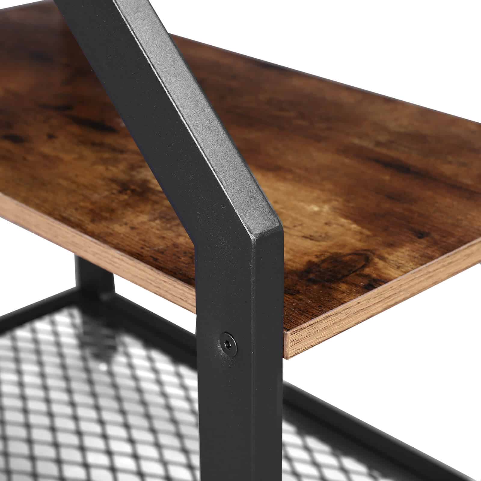Juodas geležinis rėmas ir mediniai stalviršiai suteikia šoniniam stalui pakankamai tvirtumo, kad būtų galima laikyti daugybę daiktų. Viršutinė vintažinė lentyna gali būti apkrauta iki 20 kg, vidurinė – 10 kg, o tinklinė lentyna – 20 kg (maksimali statinė apkrova).