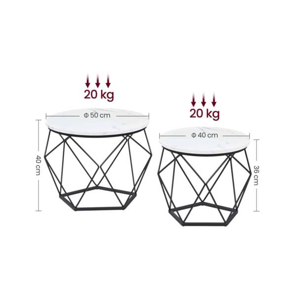 Šis elegantiškas kavos staliukų komplektas, sudarytas iš dviejų staliukų, puikiai tiks jūsų svetainės interjerui. Staliukai yra balto-juodos spalvos, todėl lengvai derės prie įvairių baldų ir dekoro elementų.