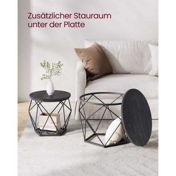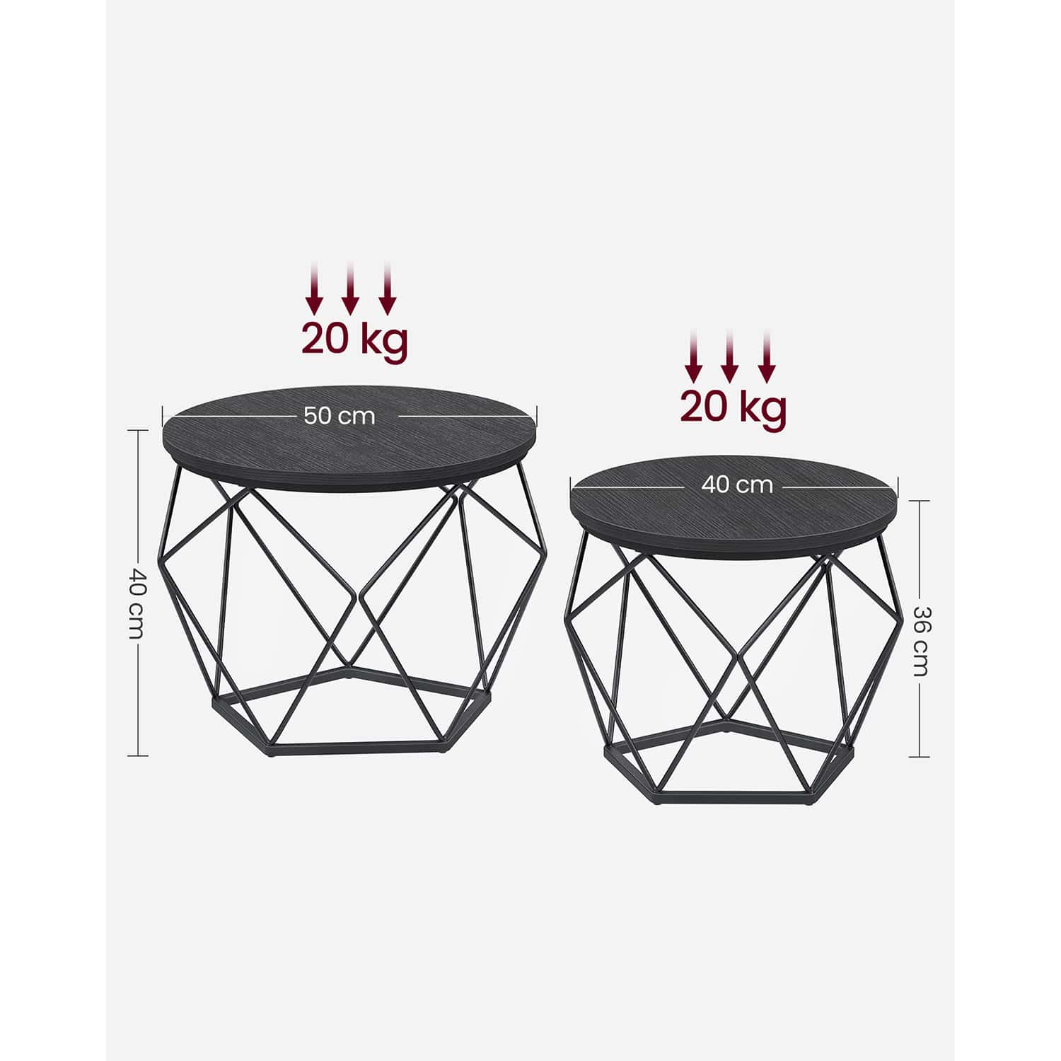 Šis kavos staliukų komplektas, kurį sudaro du juodos spalvos staliukai, yra puikus pasirinkimas jūsų svetainei ar biurui. Staliukai pagaminti iš aukštos kokybės medienos drožlių plokštės ir plieno, užtikrinantys ilgaamžiškumą ir stabilumą.
