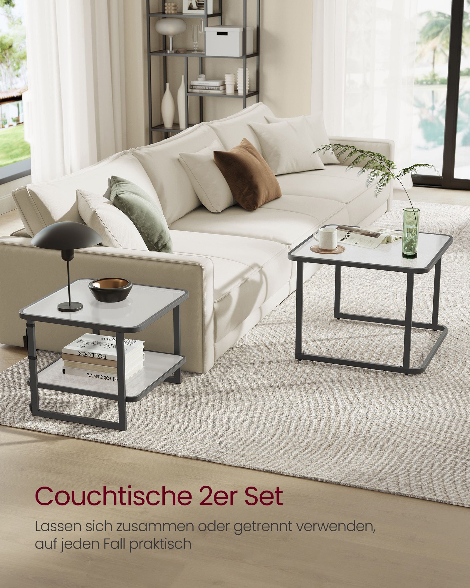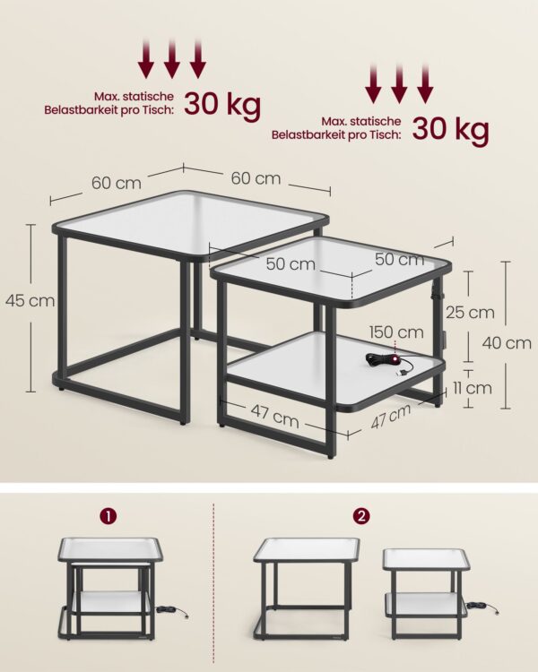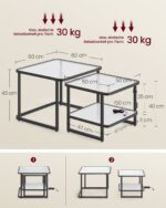 Pagamintas iš aukštos kokybės grūdinto stiklo ir plieno, šis komplektas yra tvirtas ir ilgaamžis. Didelio stalo matmenys yra 60 x 60 x 45 cm, o mažo stalo – 50 x 50 x 40 cm. Bendras komplekto svoris siekia 16,7 kg.