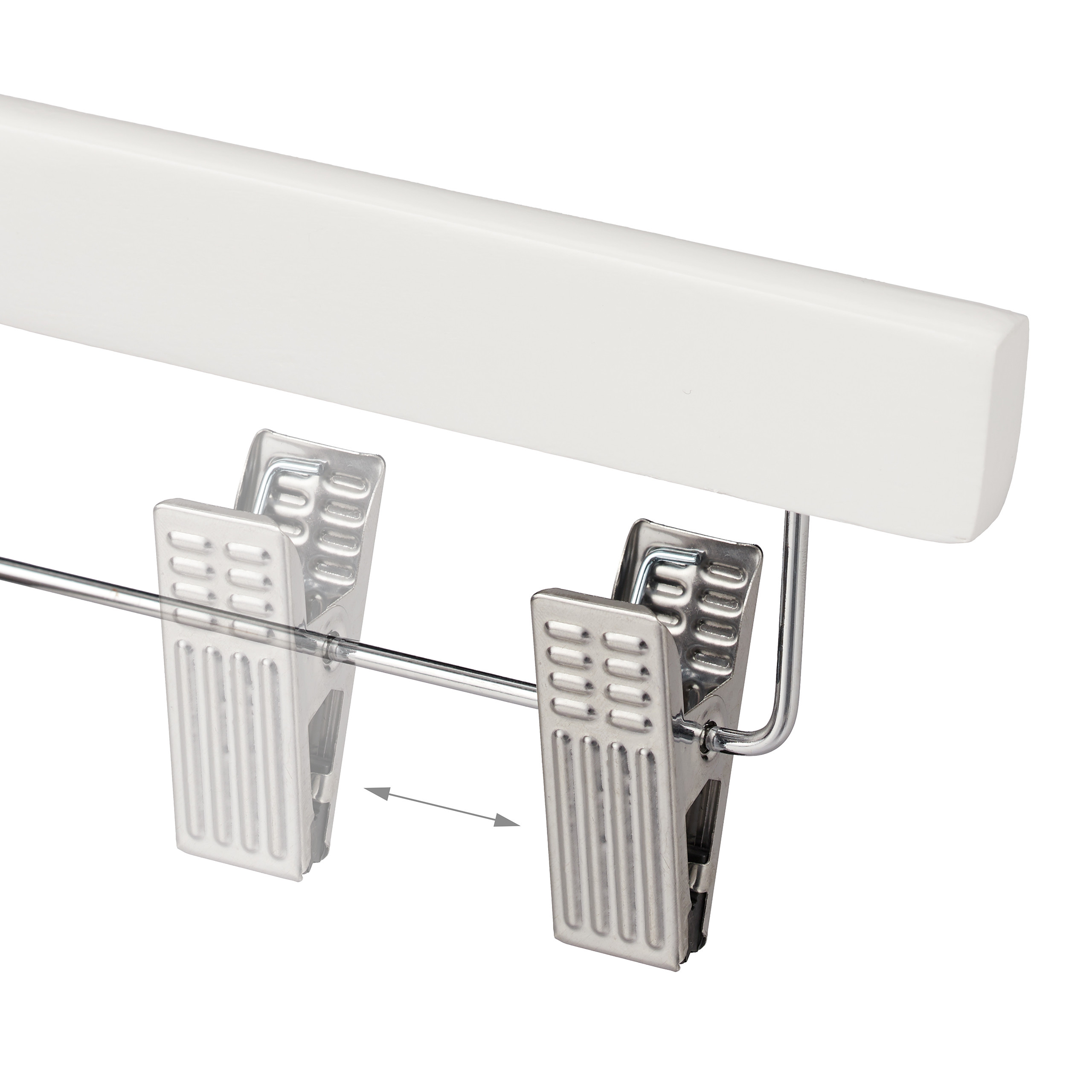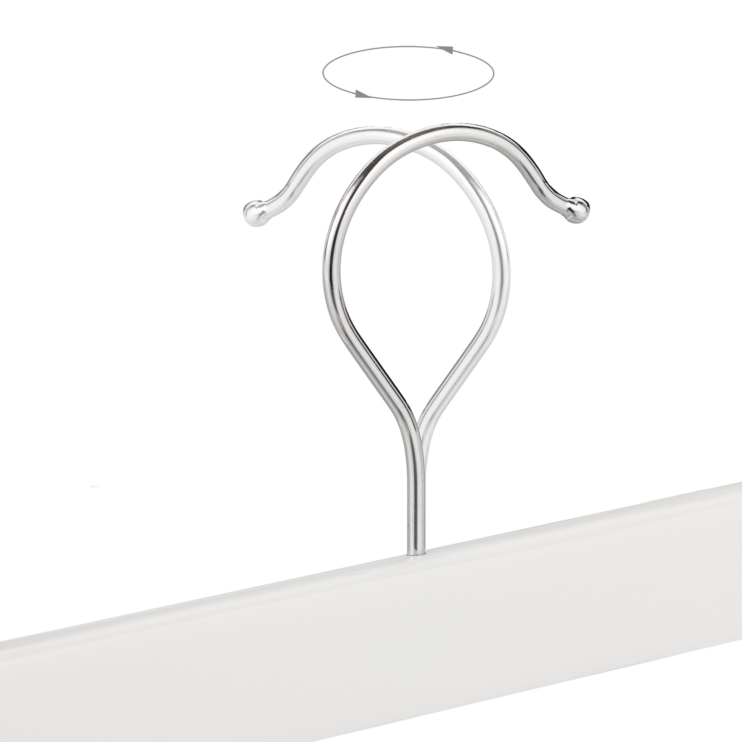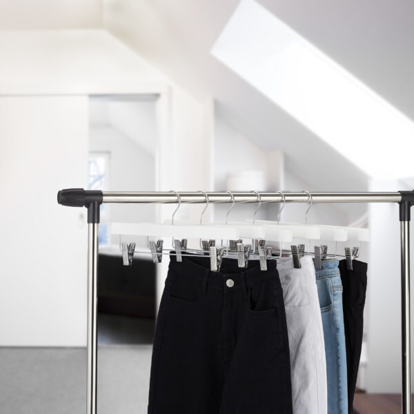 Pasirinkite šias baltos ir sidabrinės spalvos kelnių pakabas, kad jūsų drabužiai būtų saugiai laikomi ir jūsų spinta atrodytų nepriekaištingai.