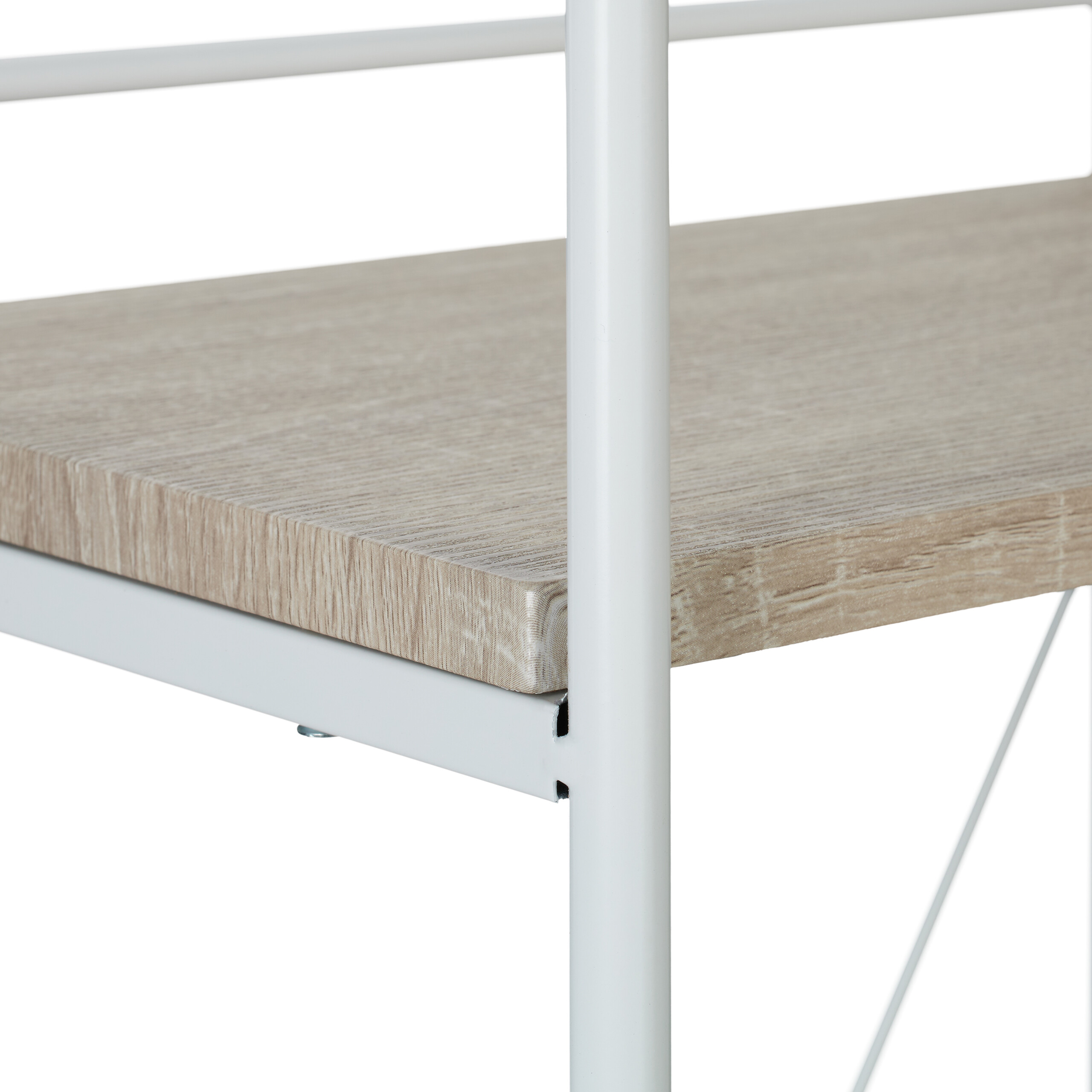 Lentyna stebina savo dekoratyviniu dizainu, kuriame dera baltas plieno rėmas ir šviesaus medžio lentynos. Šis derinys suteikia modernumo ir šilumos Jūsų namams.