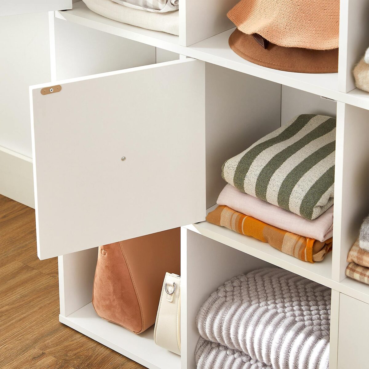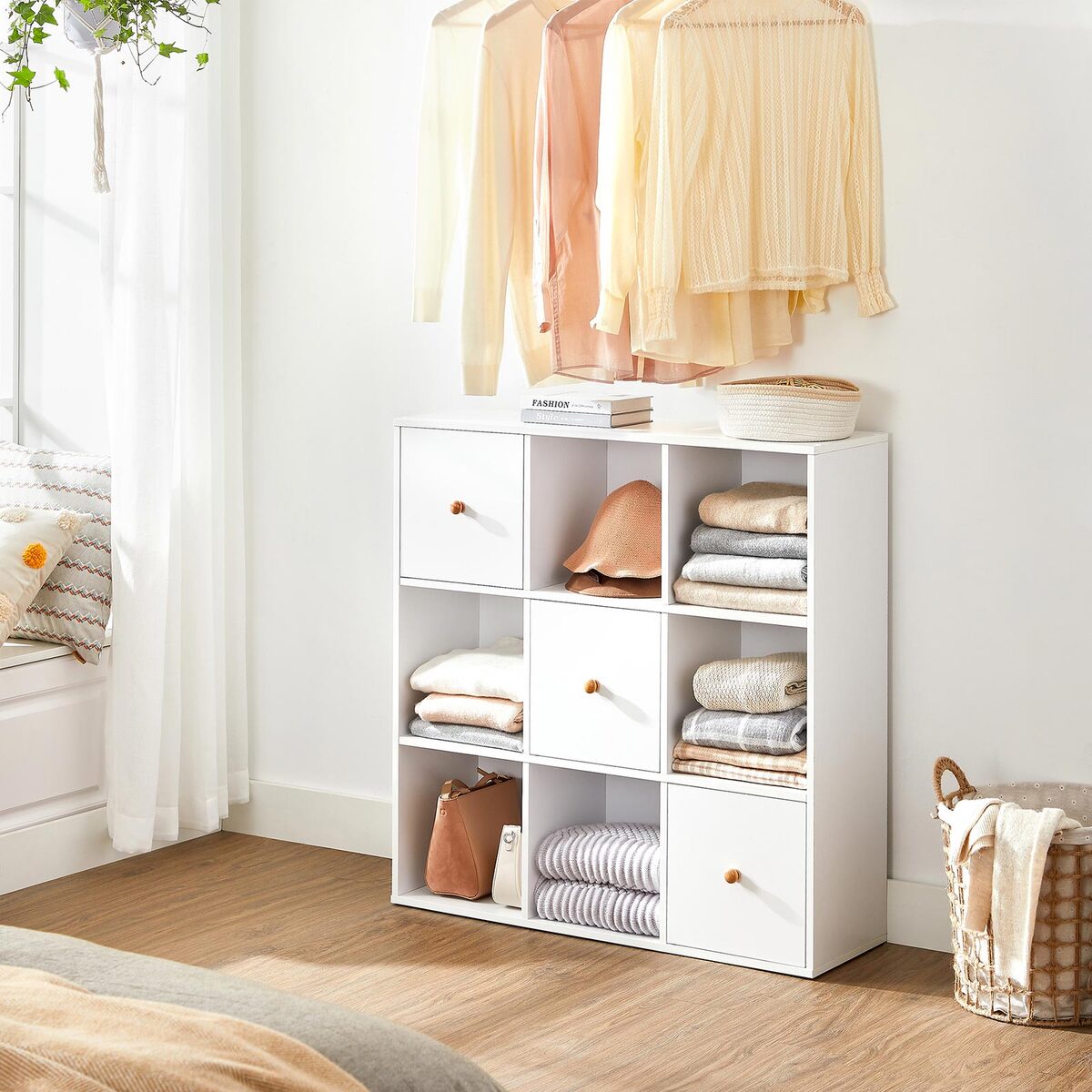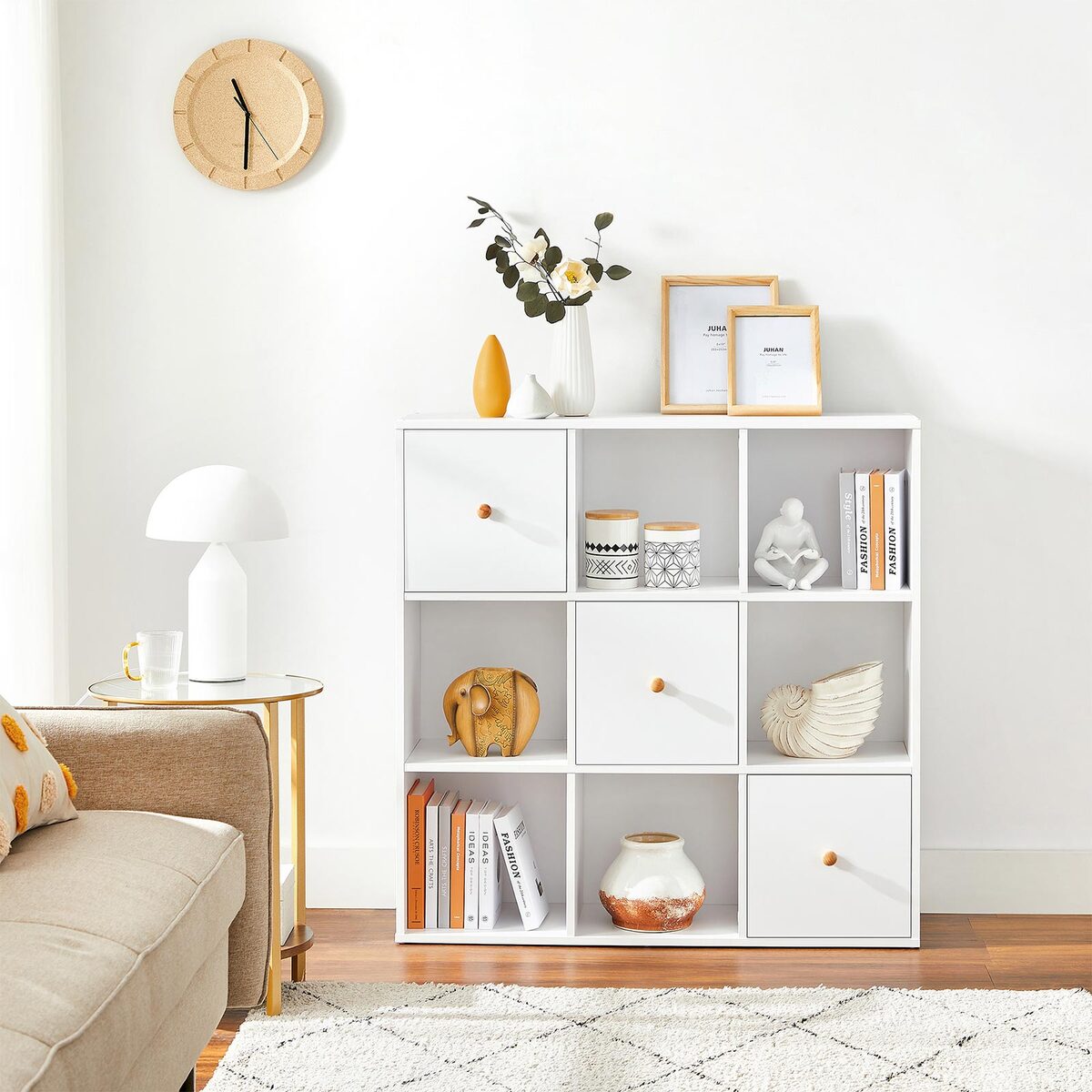 Viršutinė lentyna puikiai tinka paveikslų rėmams, garsiakalbiams ir kitiems dekoratyviniams elementams. Balto paviršiaus ir natūralių spalvų rankenų derinys ant durų suteikia šiai lentynai ypatingą stilių ir eleganciją.
