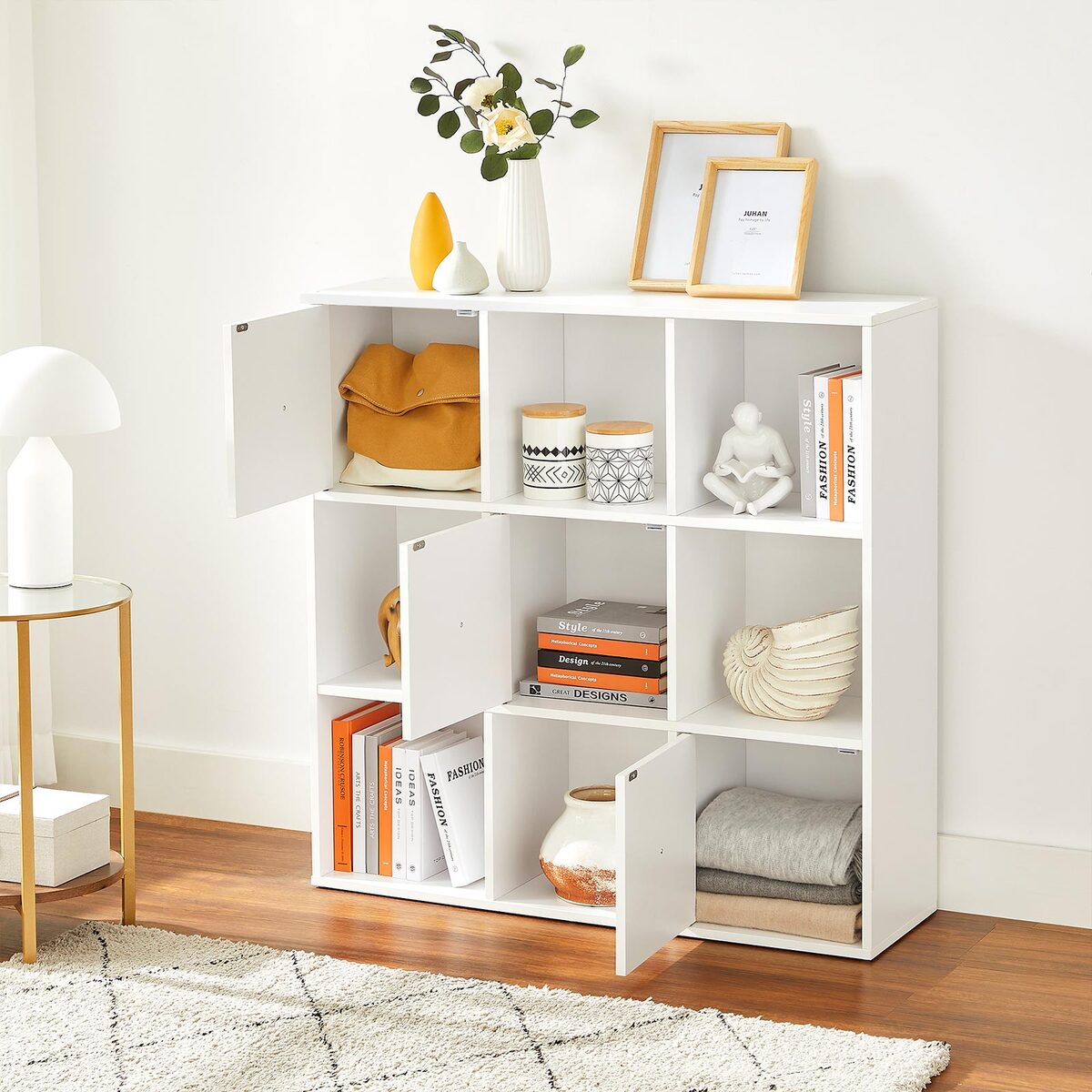 Knygų lentyna su durelėmis, balta, yra puikus sprendimas jūsų daiktams laikyti ir organizuoti. Ši lentyna turi 9 skyrius, iš kurių 3 yra su durelėmis, todėl galite patogiai laikyti įvairius daiktus.