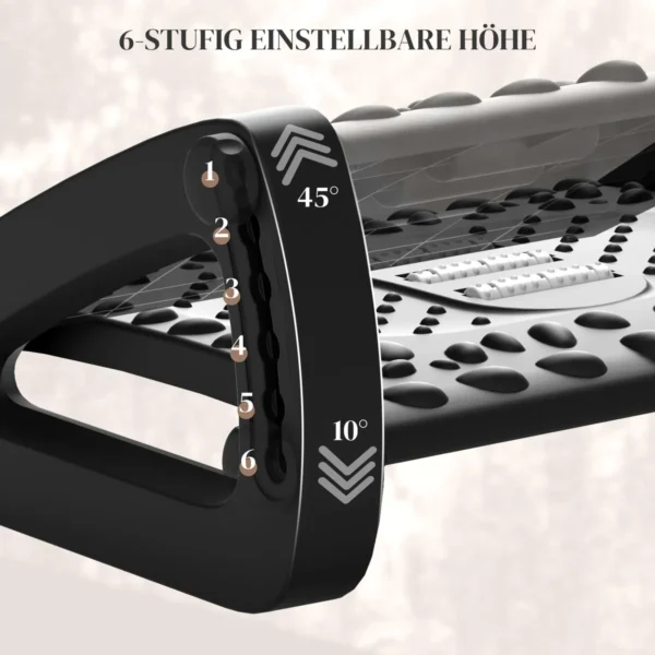 Pagerinkite sėdėjimo komfortą su HOMCOM kojų atrama po stalu. Ši ergonomiška pėdų atrama pakelia kojas, pagerina laikyseną ir siūlo 6 krypčių aukščio reguliavimą, kad būtų ideali atrama. Masažinės tekstūros paviršius ir keturi voleliai ant kojų atramos taip pat atgaivina pavargusias pėdas. Idealiai tinka kaip kėdutė prie stalo ir namuose, ir biure ilgoms, bet vis tiek malonioms darbo ar mokymosi valandoms.