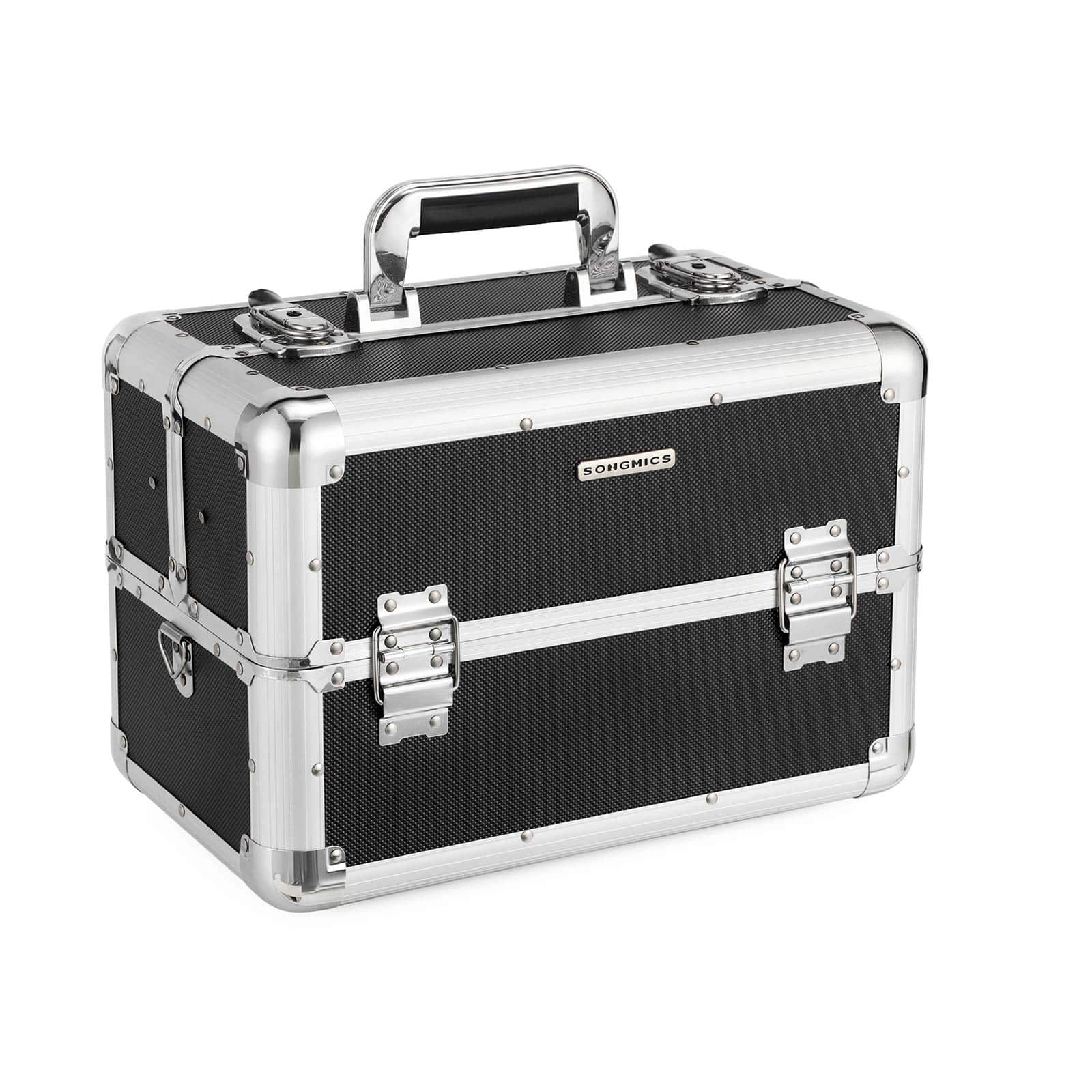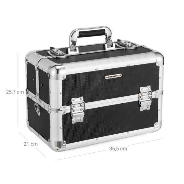 Dėl elegantiškos išvaizdos šis makiažo lagaminas yra tikras akių gaudytojas jūsų miegamajame. Dėl aliuminio juostų ir medžio dulkių plokštė (MDF) plokščių jis taip pat pasižymi tvirtumu ir mažu svoriu. Taip pat galite pasiimti jį su savimi bet kur naudodami rankenėlę ar peties dirželį.