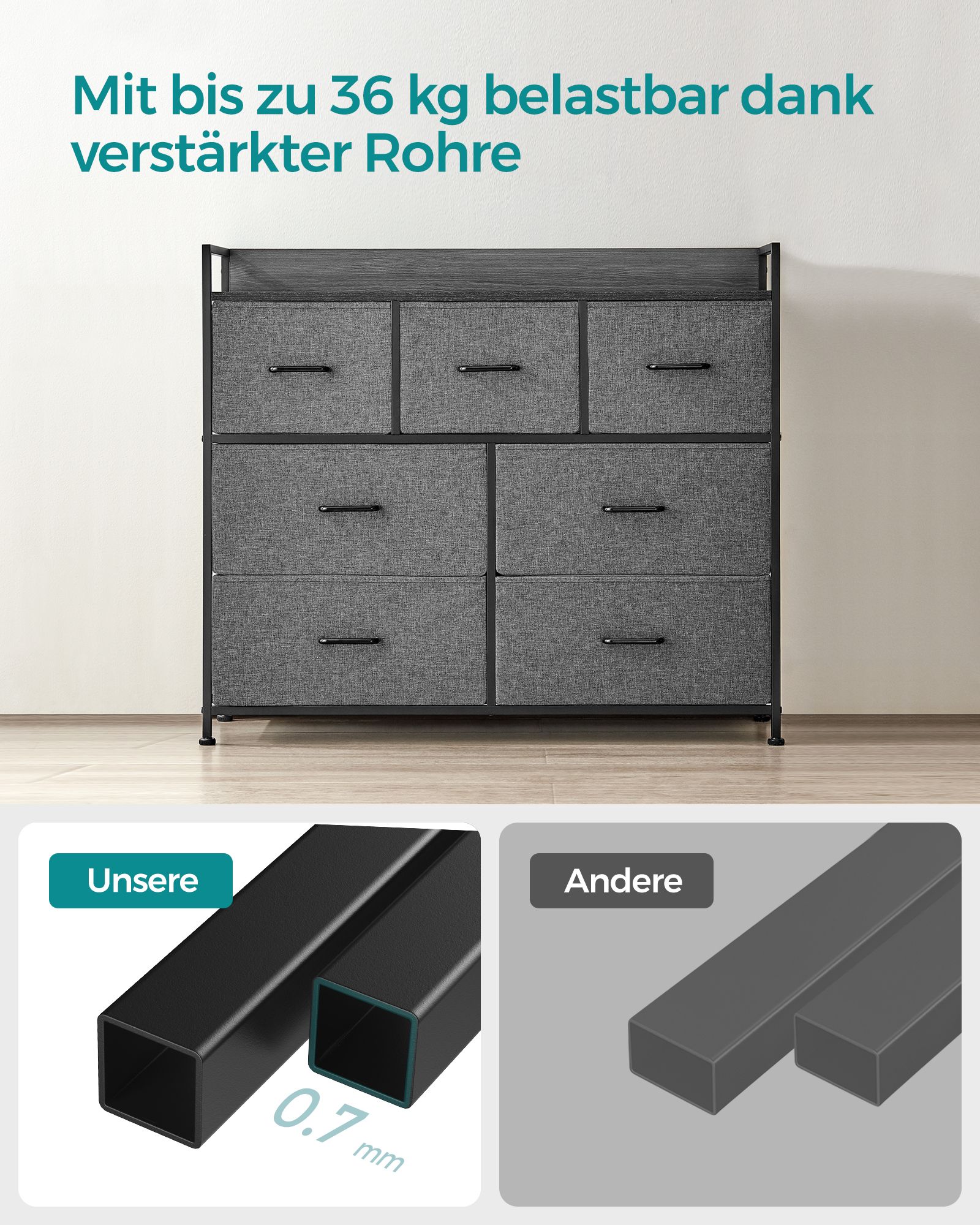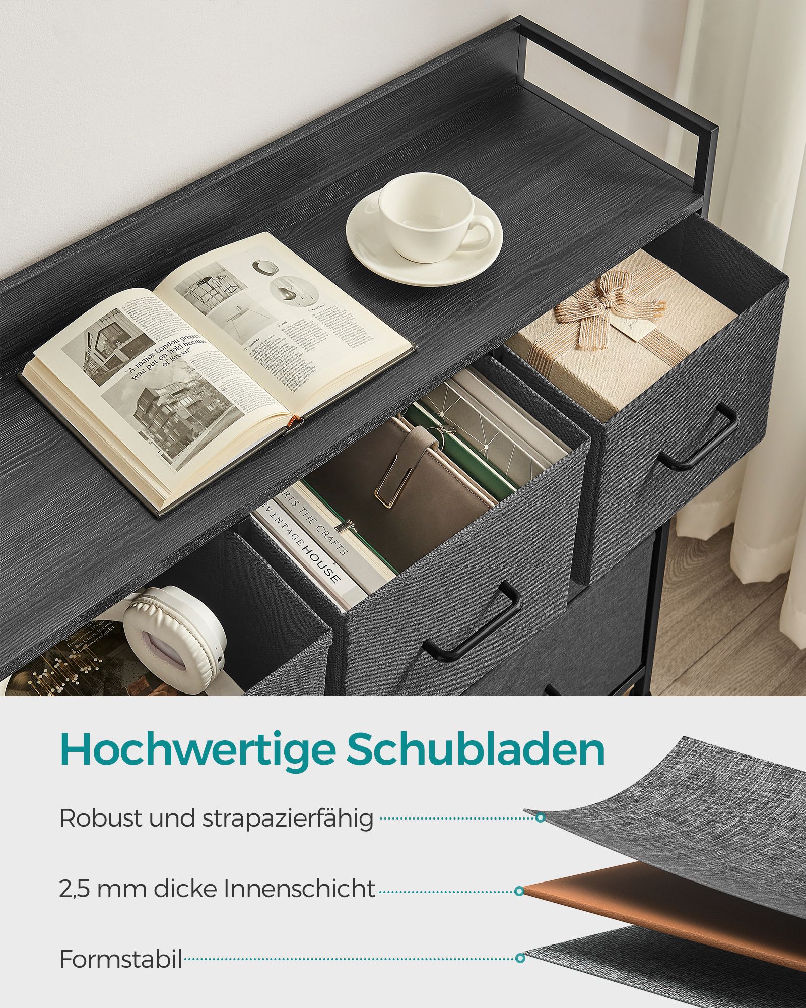 Ši elegantiška ir funkcionali komoda yra puikus pasirinkimas tiems, kurie vertina modernų dizainą ir praktiškumą. Sujungiant pilką ir juodą spalvas su subtiliais medienos grūdelių akcentais, ši komoda taps stilingu jūsų interjero akcentu.