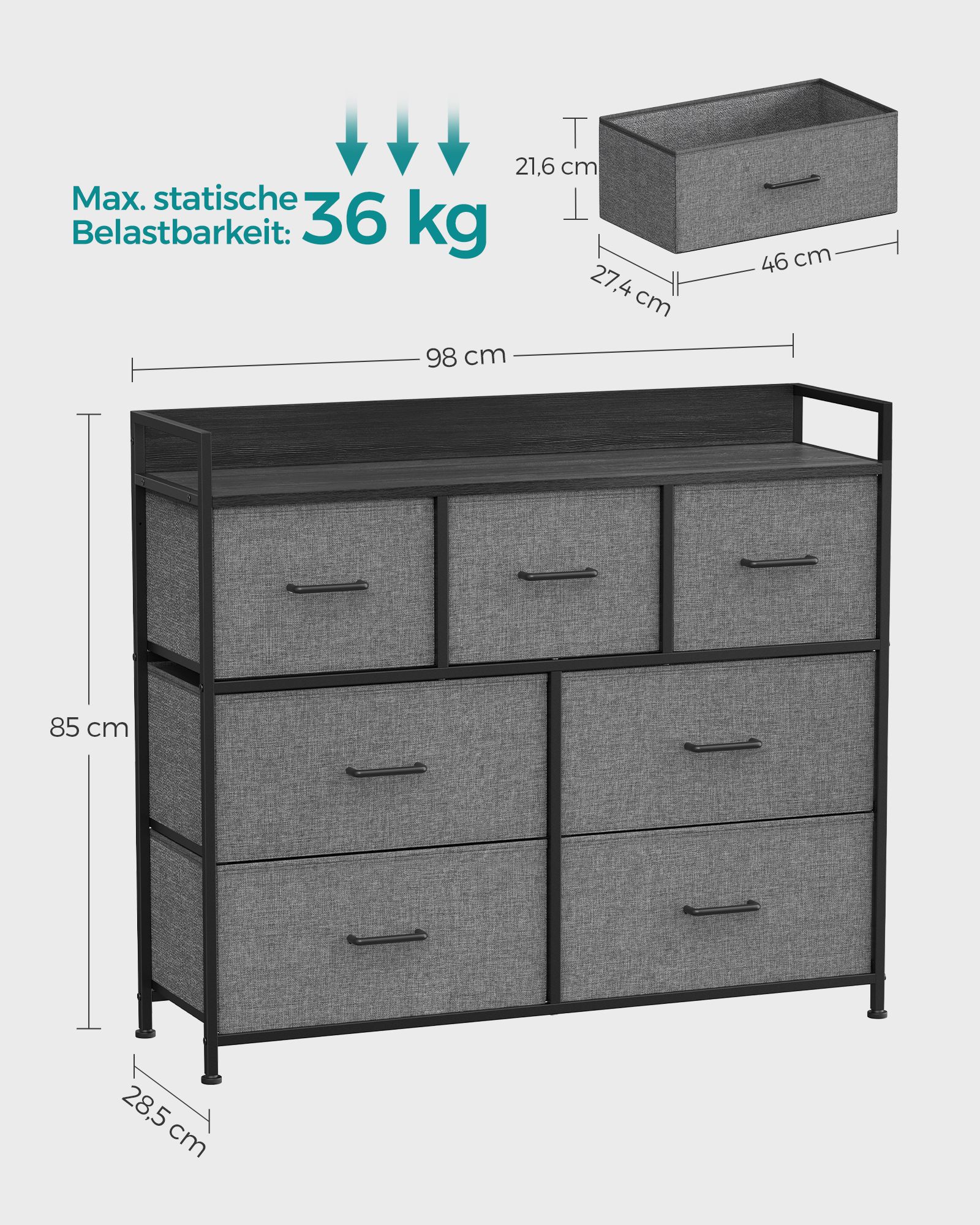 - Dydis: 28,5 x 98 x 85 cm (D x P x A)