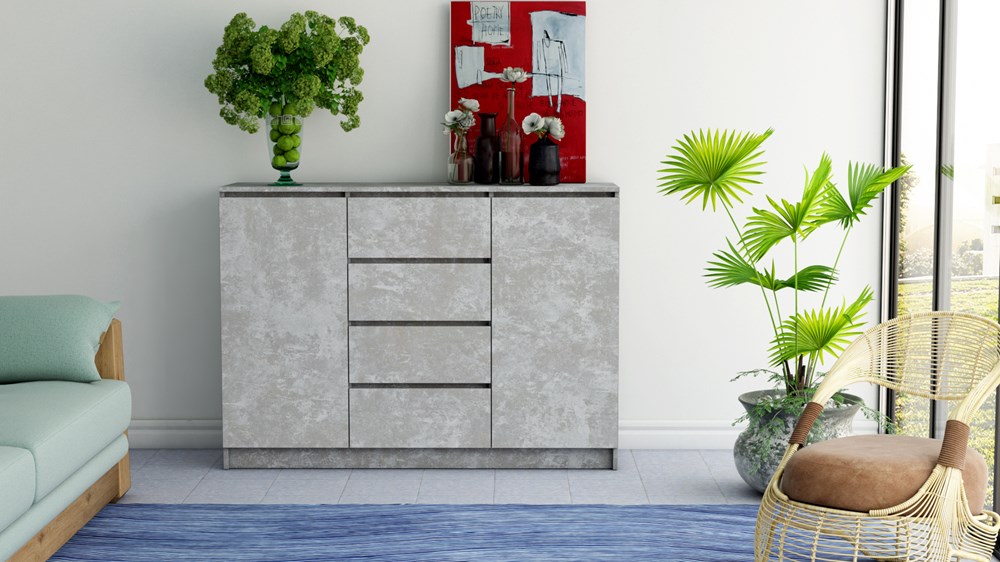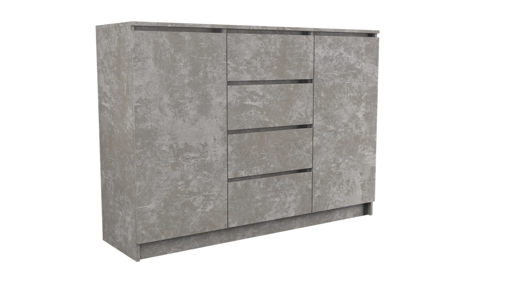 dviejų durų, keturių stalčių komoda;