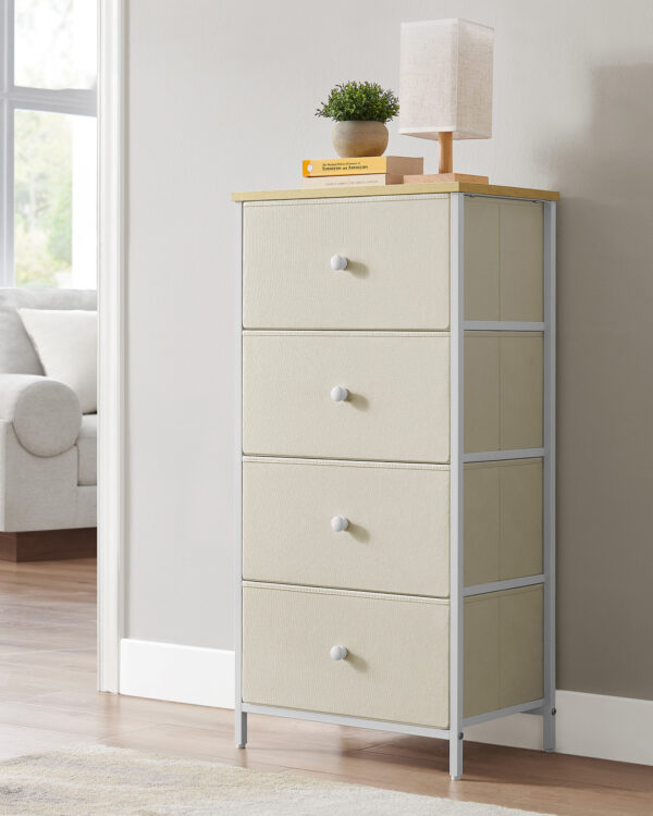 - Medžiaga: Pagaminta iš aukštos kokybės medžio drožlių plokštės, plieno ir medžiaginio stalčiaus priekinės dalies, ši komoda yra tvirta ir ilgaamžė.