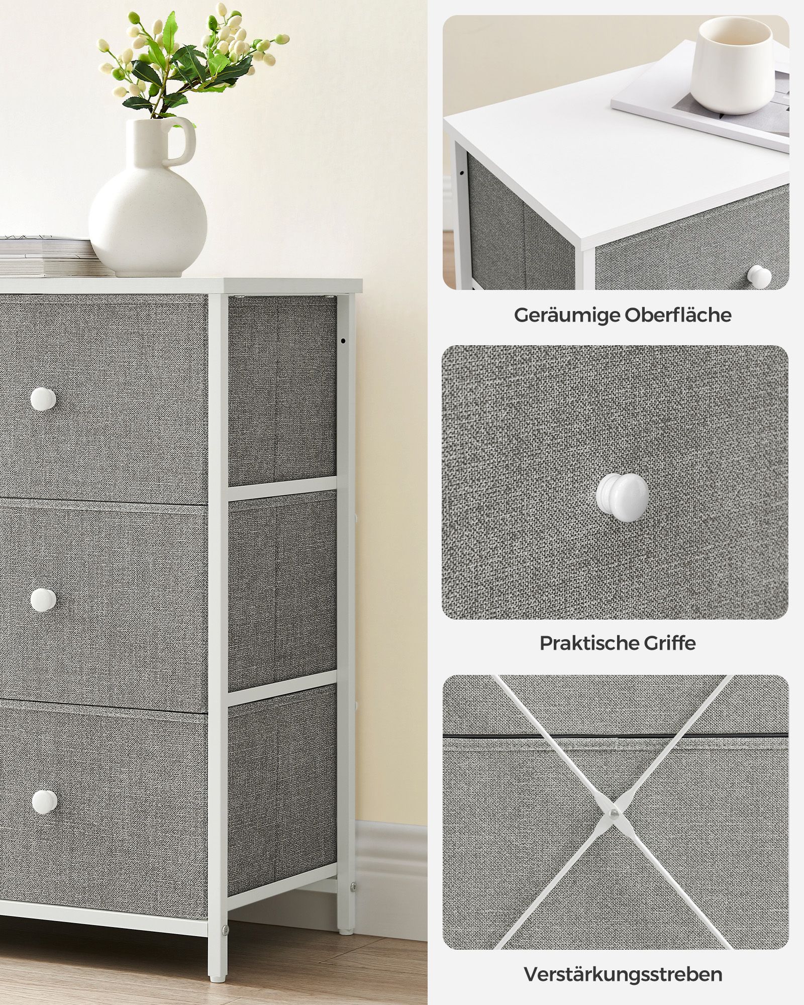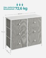 Ši stilinga komoda, pasižyminti šviesiai pilkos ir baltos spalvų deriniu, yra puikus pasirinkimas tiems, kurie vertina modernų dizainą ir praktiškumą. Pagaminta iš aukštos kokybės medžiagų, ši komoda ne tik papuoš jūsų interjerą, bet ir suteiks papildomos vietos daiktams laikyti.