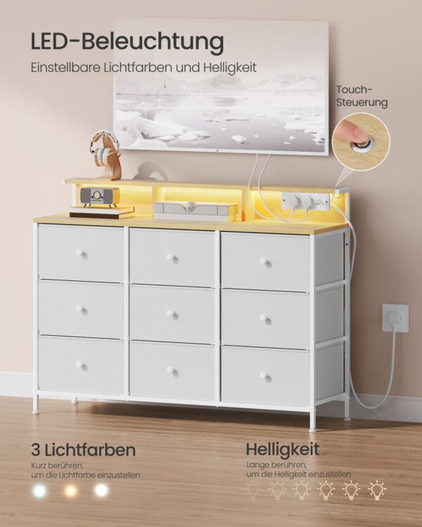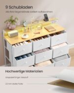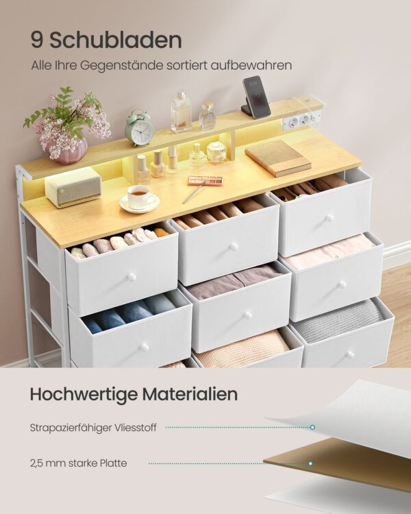 Pagaminta iš aukštos kokybės medžio drožlių plokščių, plieno, MDF ir Oksfordo audinio, ši komoda yra tvirta ir ilgaamžė. Jos svoris siekia 17,5 kg.