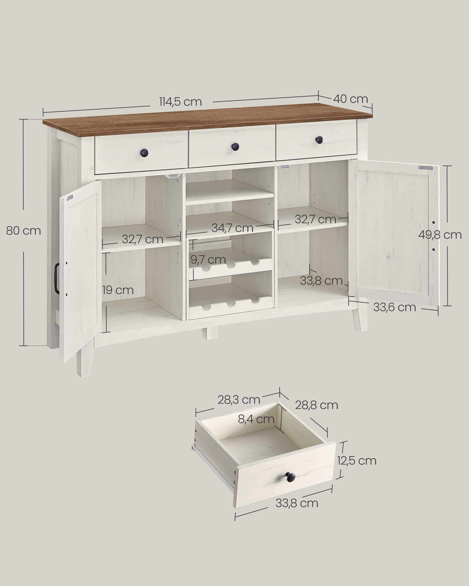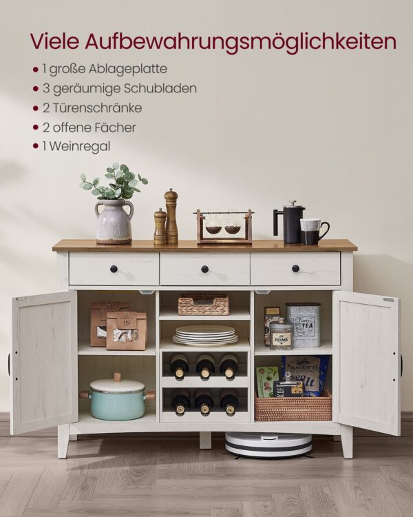 Ši komoda, kurios spalva yra vintažinė balta-medaus ruda, puikiai tiks jūsų interjerui, suteikdama jam elegancijos ir šilumos. Jos dydis yra 40 x 114,5 x 80 cm, o svoris siekia 42,3 kg.