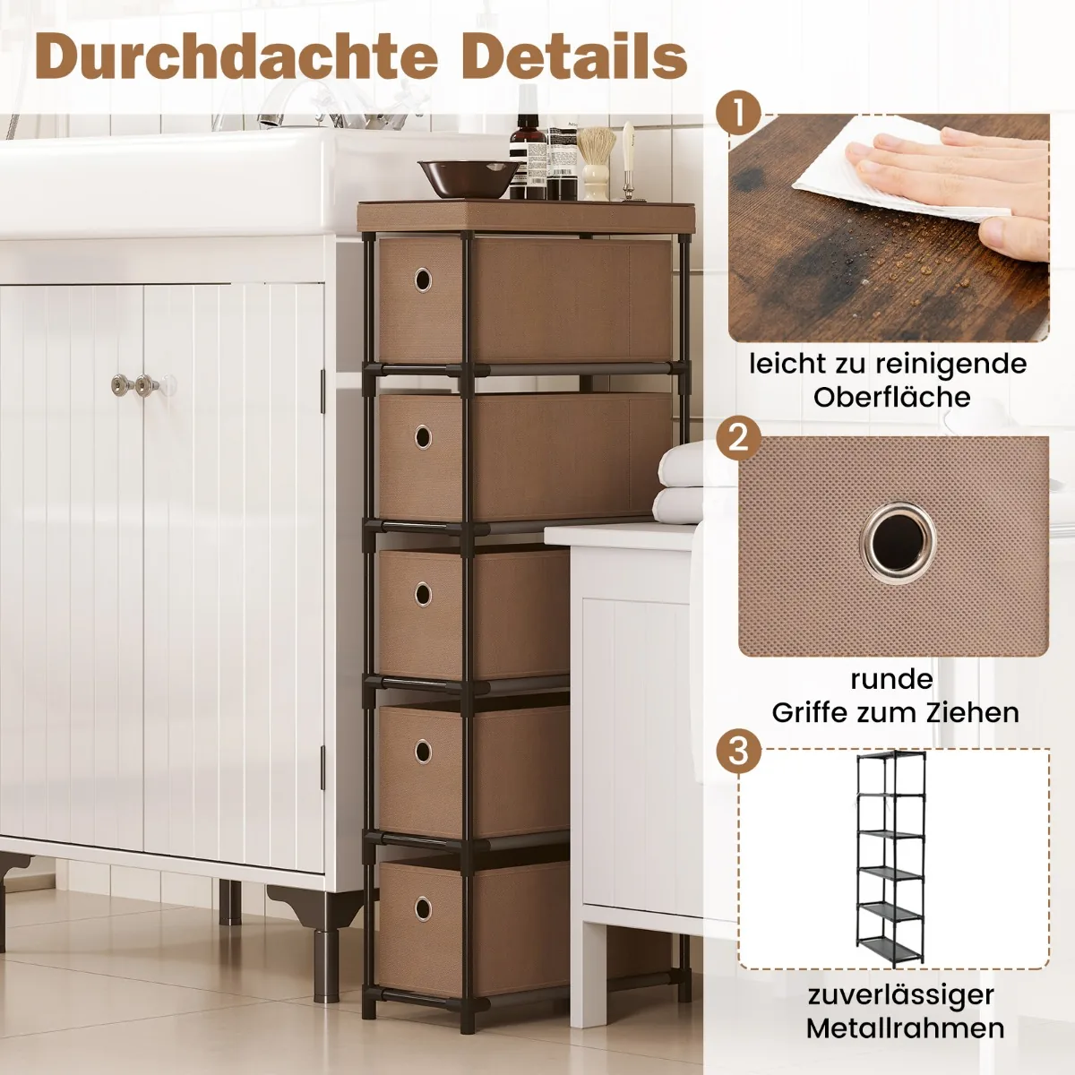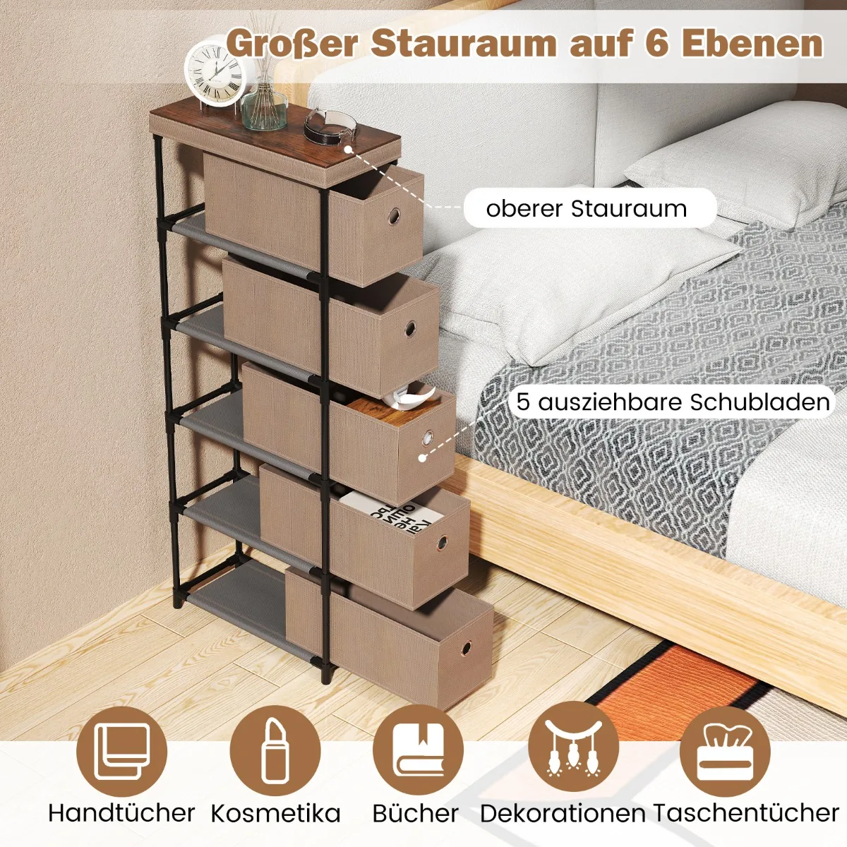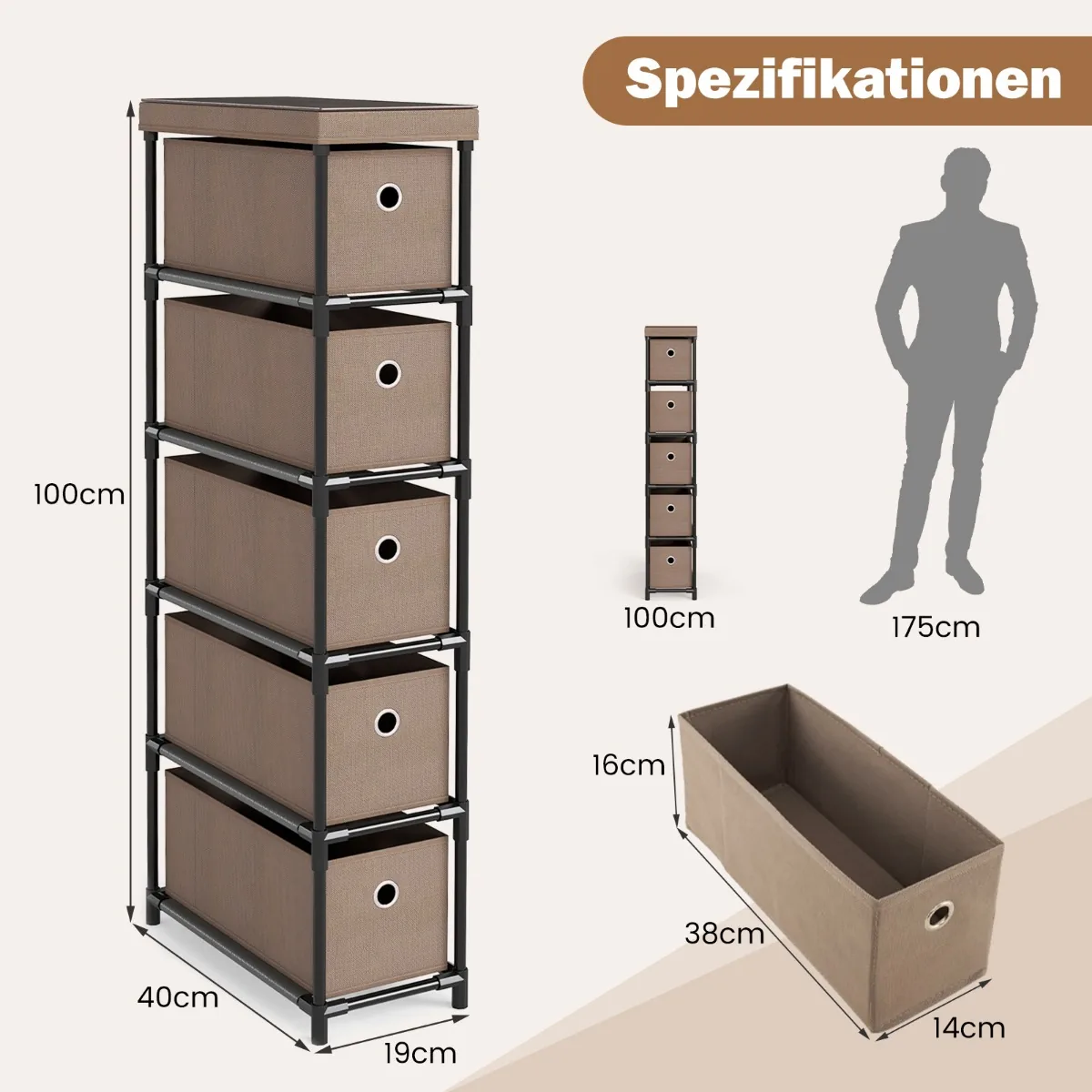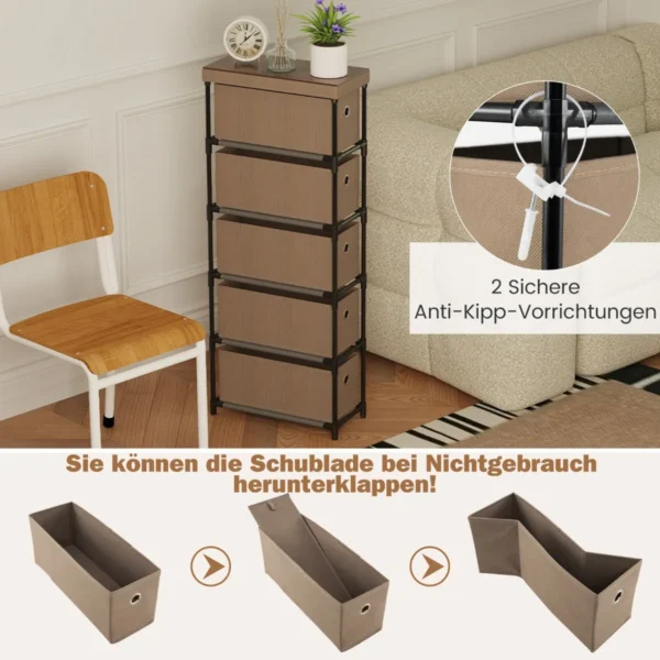 - 5 išimami, sulankstomi stalčiai iš poliesterio audinio leidžia sutvarkyti įvairius daiktus.
