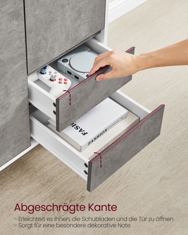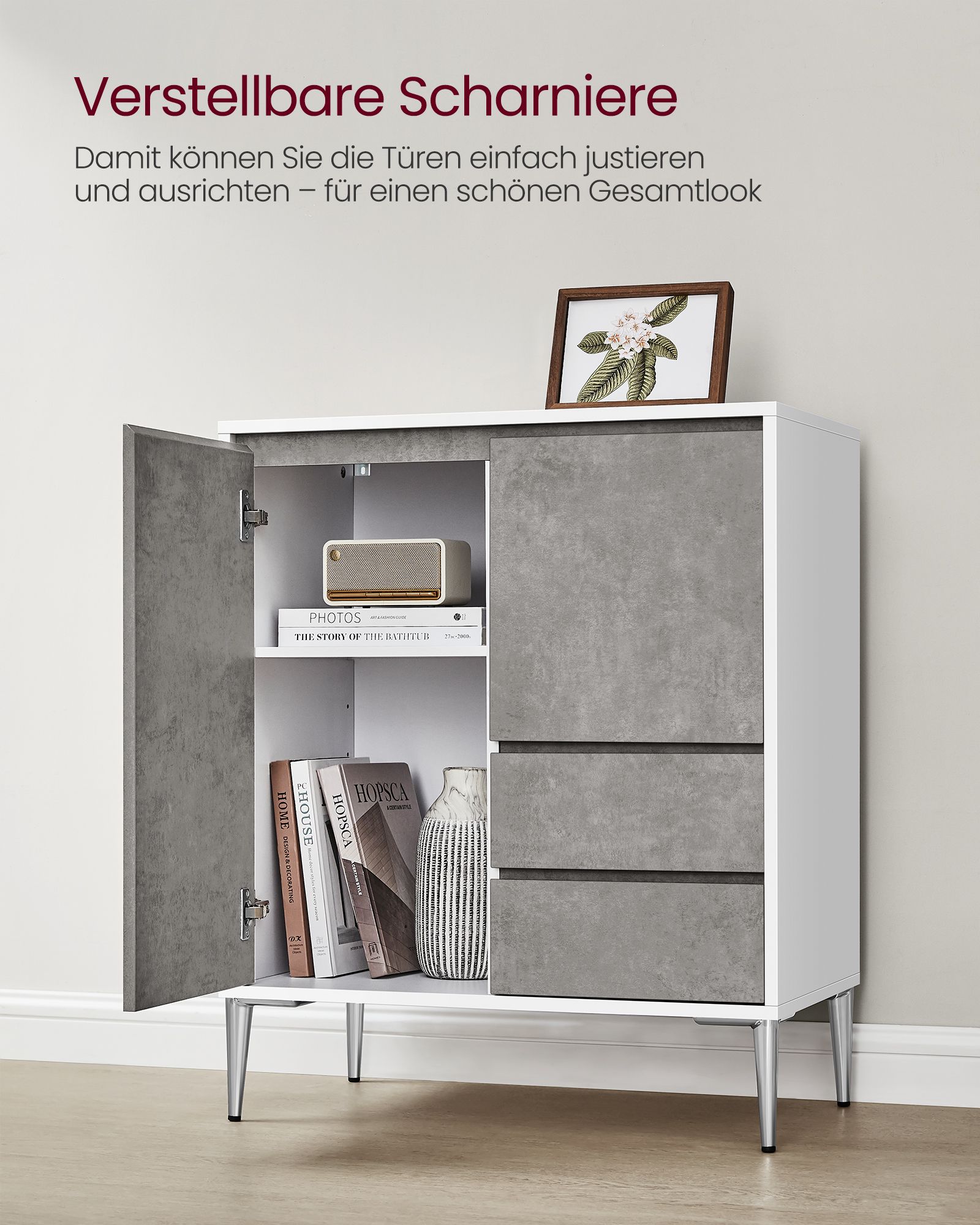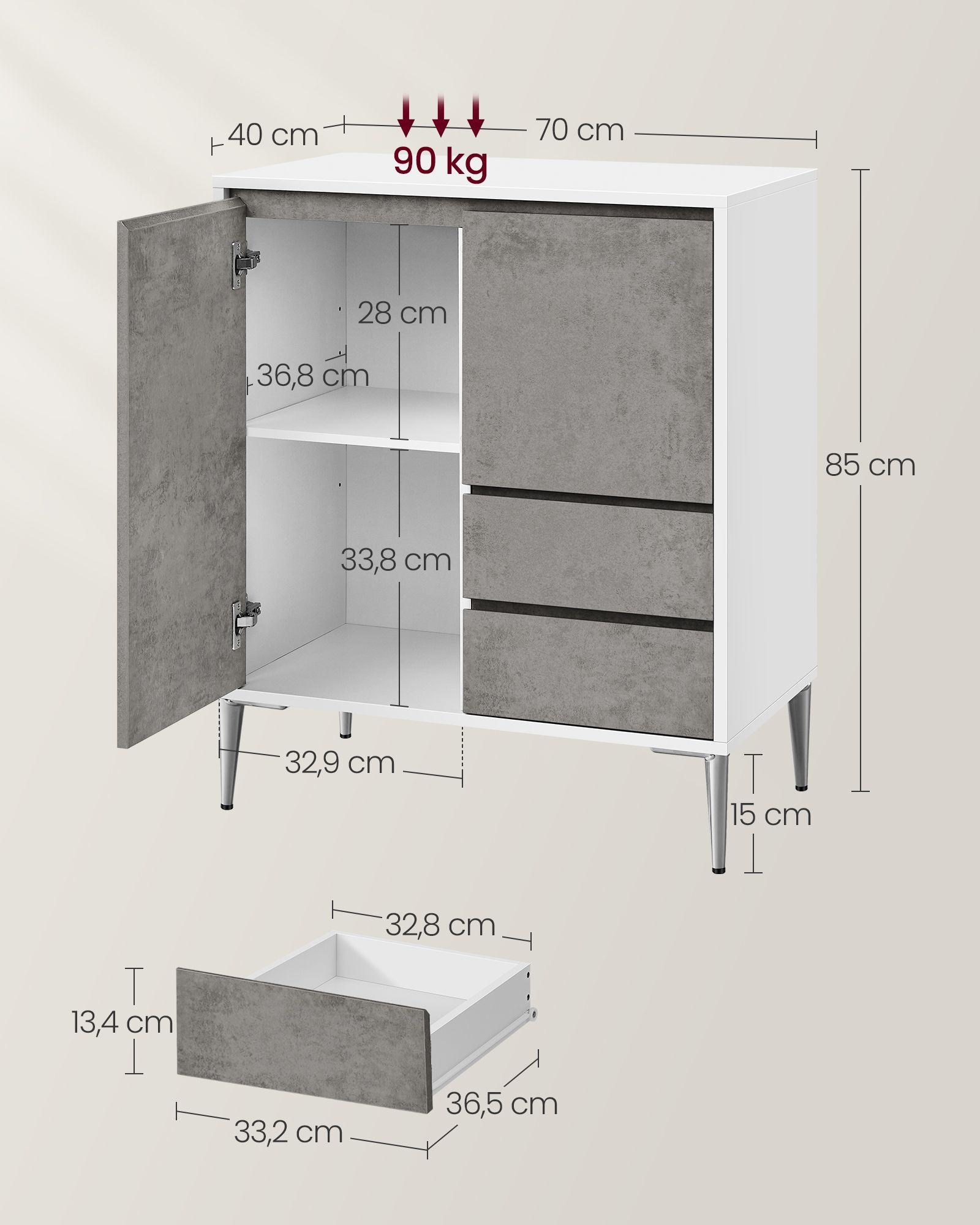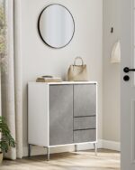 Ši elegantiška ir funkcionali komoda yra puikus pasirinkimas tiems, kurie vertina modernų dizainą ir praktiškumą. Jos subtilus pilkos ir baltos spalvų derinys suteiks jūsų interjerui šiuolaikiškumo ir stiliaus.