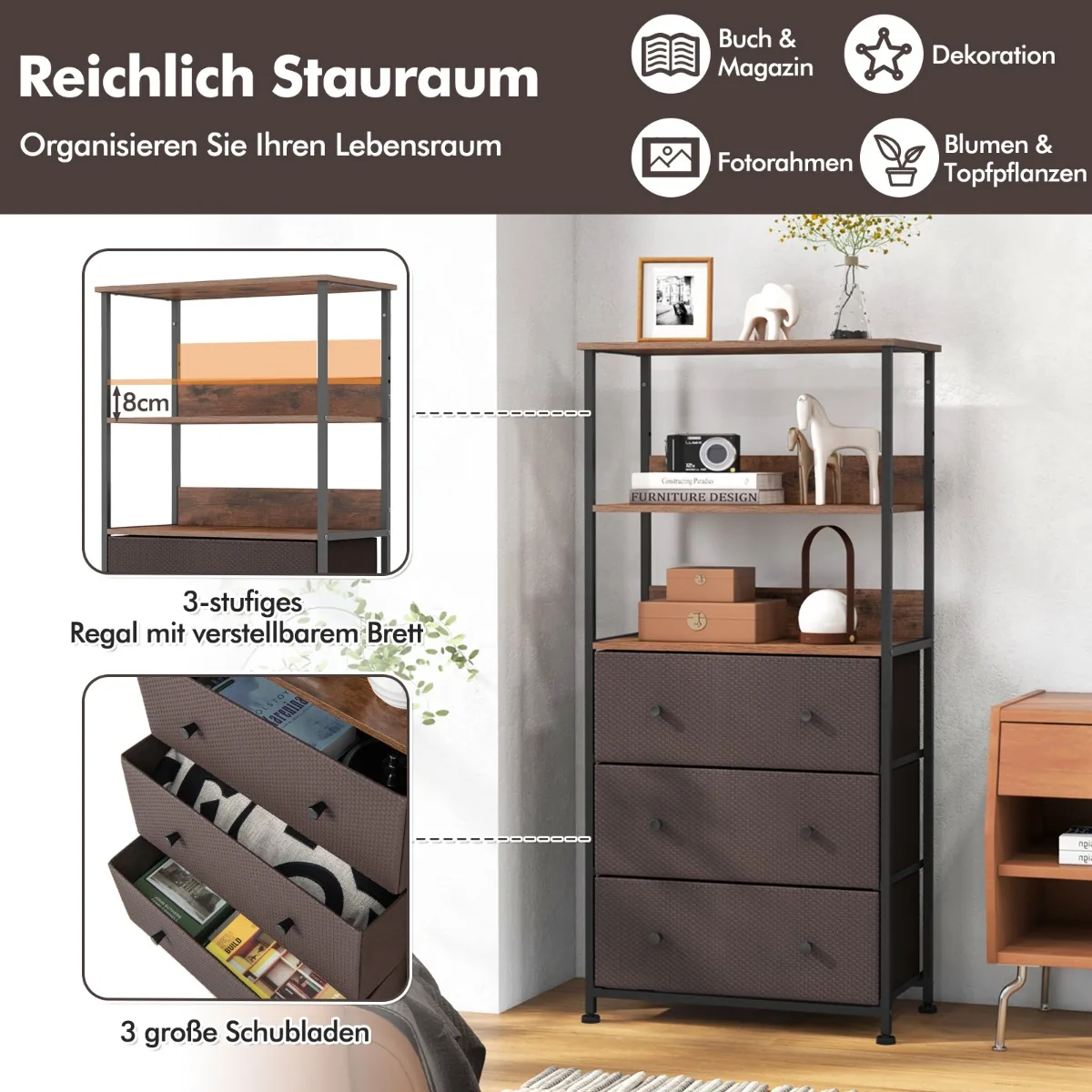 - 3 pakopų lentyna su reguliuojamomis lentomis prisitaiko prie skirtingų poreikių.