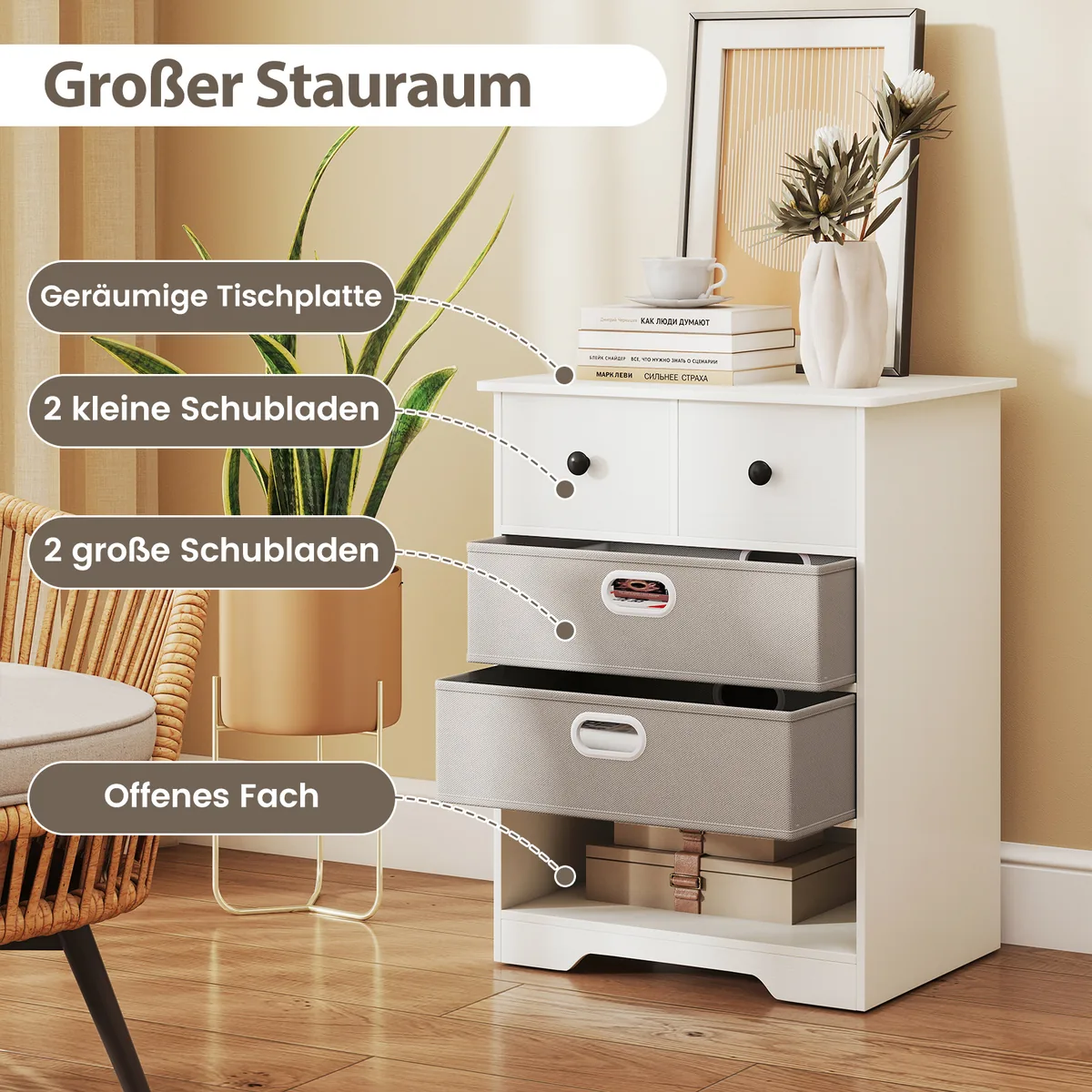 - Lankstūs ir išimami medžiaginiai stalčiai prisitaiko prie įvairių poreikių.