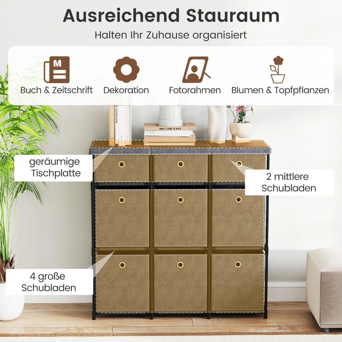 - Komodoje yra 9 ištraukiami stalčiai ir erdvus stalviršis, tinkantys kasdieniams daiktams laikyti.