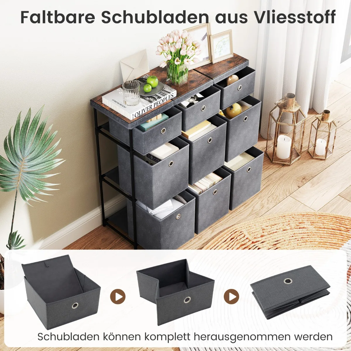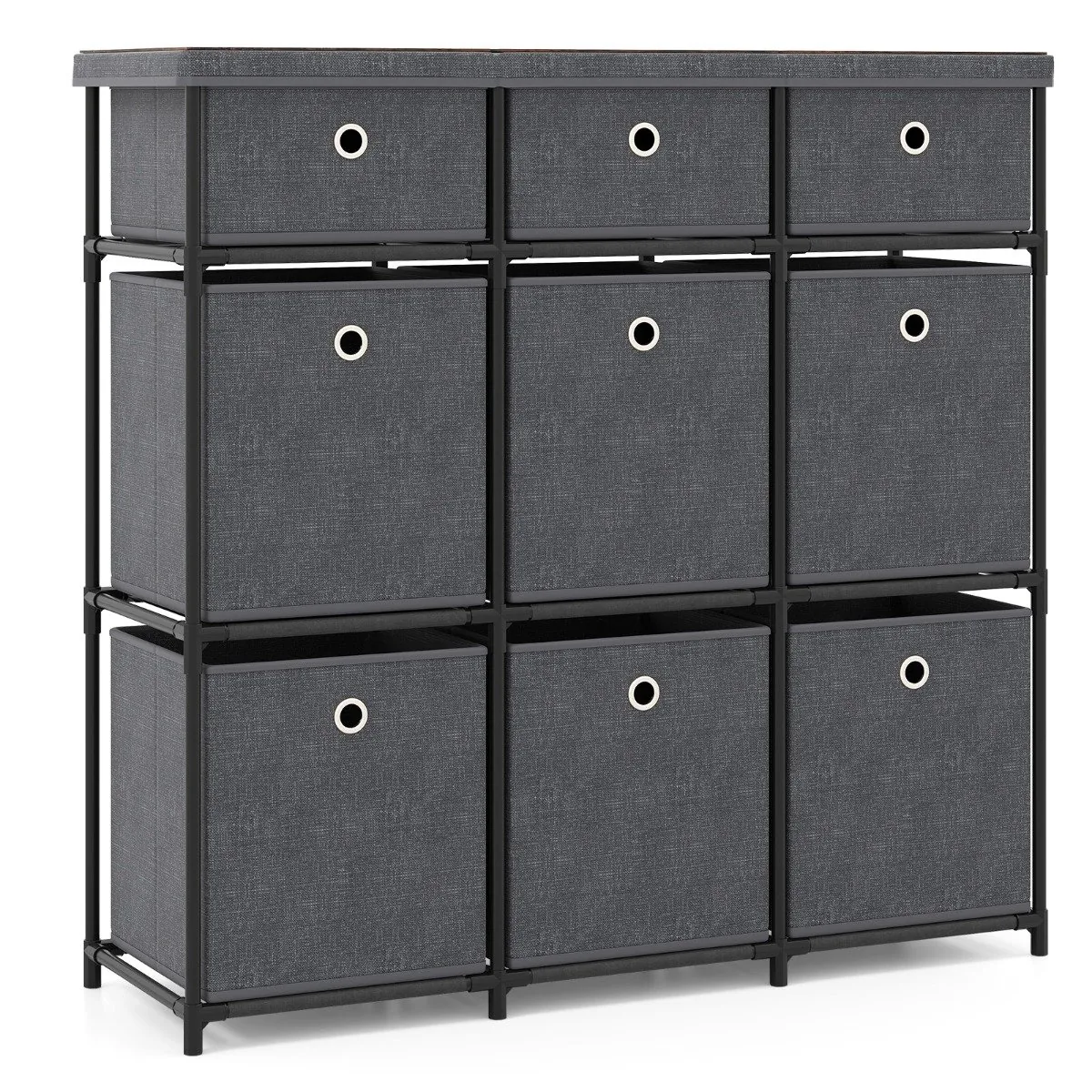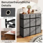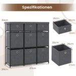 Komoda 87x29x84cm, tamsiai pilkos/juodos spalvos, pasižymi dideliu saugojimo pajėgumu ir tvirtumu. Šis baldas su 9 stalčiais puikiai tinka įvairiems daiktams laikyti ir palaikyti tvarką namuose ar biure.