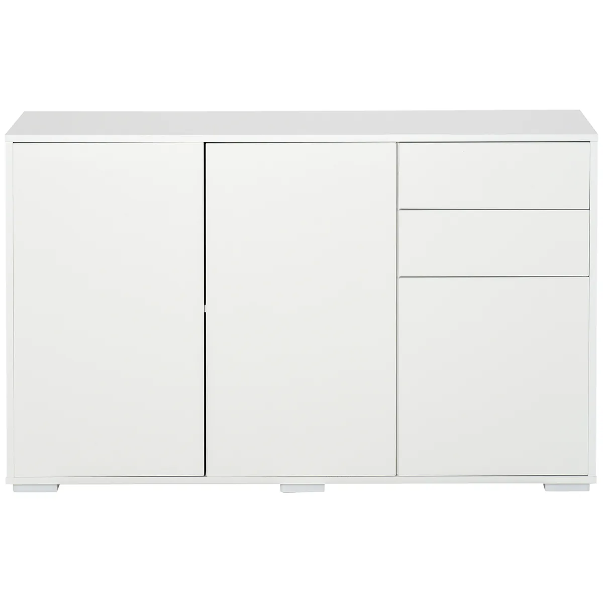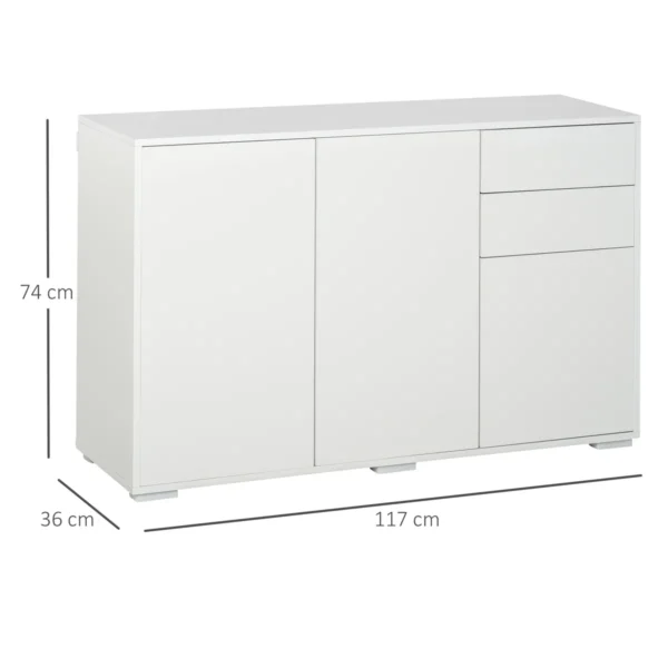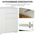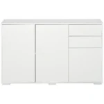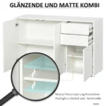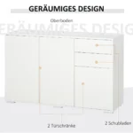 Ši moderni HOMCOM svetainės spintelė ne tik siūlo daug vietos daiktams saugoti, bet ir stebina šiuolaikišku dizainu. Spintoje yra stumdomi stalčiai ir spintelės durelės, kurios užsidaro greitai ir be jokių pastangų. Virtuvės komodos konstrukcija pagaminta iš medžio drožlių plokštės. Ši medžiaga yra patvari ir lengvai prižiūrima. Svetainėje, prieškambaryje ar biure – ši komoda puikiai atrodo bet kur.