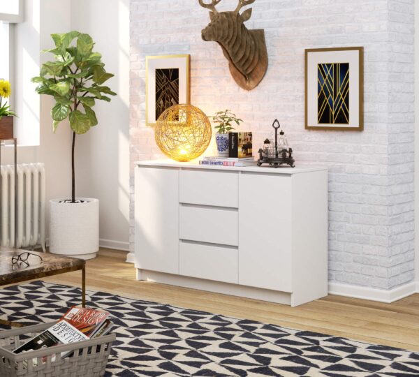 – Komoda pagaminta iš aukštos kokybės 16 mm laminuotos plokštės, atspari dilimui – Stalčių fasadai pagaminti iš laminuotos plokštės – Stalčiai yra ant metalinių ritinėlių kreiptuvų – Kraštai faneruoti su ABS briauna, užtikrinančia aukštą apsaugą nuo pažeidimų – Durelių viduje yra viena lentyna – Savarankiškai surenkama komoda – Pateikiamas vadovas – Garantija 24 mėnesių