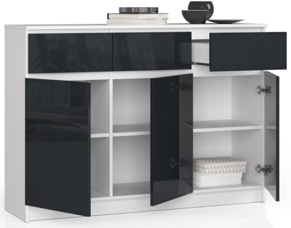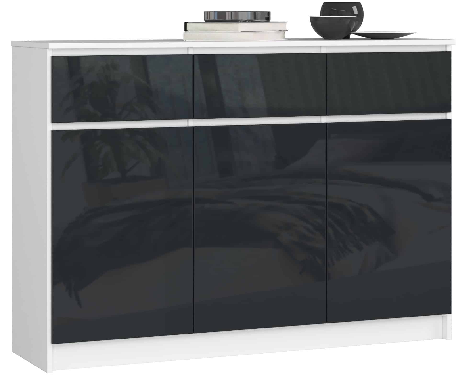 Komoda iš aukštos kokybės 16 mm laminuotos plokštės, atsparios dilimui. Kompaktinį diską pateikia gamintojas Kronospan Stalčių fasadai pagaminti iš laminuotos plokštės Stalčiai veikia ant metalinių slydimo ritinėlių Kraštai padengti ABS apvadu, kad būtų gerai apsaugoti nuo pažeidimų Kiekvieno viduje durys yra viena lentyna Savarankiškai surenkama komoda Instrukcijos pridedamos 24 mėnesių garantija
