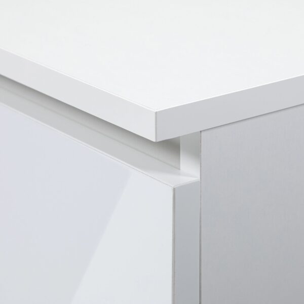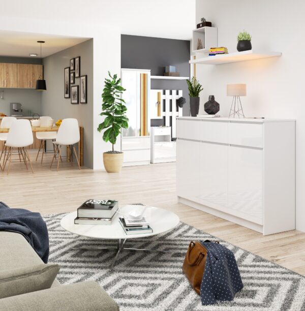 Komoda iš aukštos kokybės 16 mm laminuotos plokštės, atsparios dilimui. Kompaktinį diską pateikia gamintojas Kronospan Stalčių fasadai pagaminti iš laminuotos plokštės Stalčiai veikia ant metalinių slydimo ritinėlių Kraštai padengti ABS apvadu, kad būtų gerai apsaugoti nuo pažeidimų Kiekvieno viduje durys yra viena lentyna Savarankiškai surenkama komoda Instrukcijos pridedamos 24 mėnesių garantija