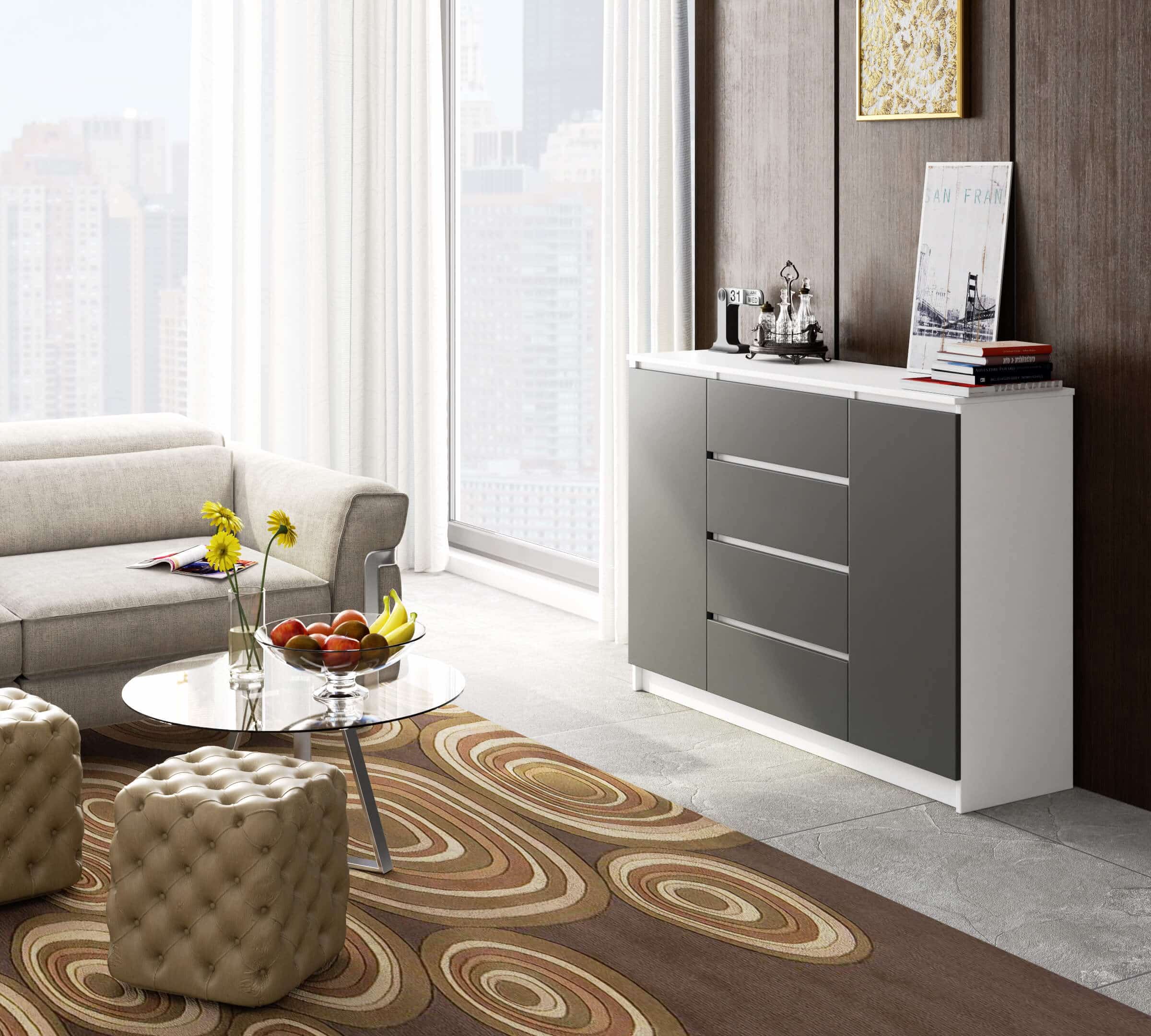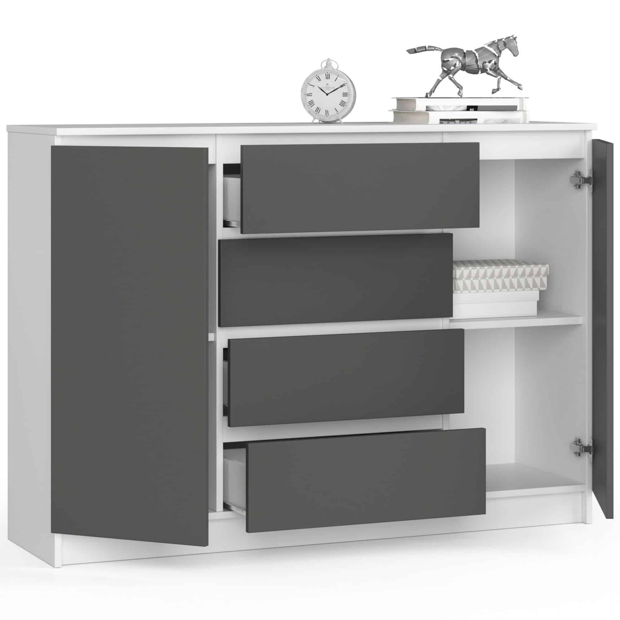 – Komoda iš aukštos kokybės 16 mm dilimui atsparios laminuotos plokštės, gamintojas Kronospan – Stalčių fasadai pagaminti iš laminuotos plokštės – Stalčiai eina ant metalinių ritinėlių – Kraštai padengti ABS briauna, kad būtų apsaugota nuo pažeidimų – Kiekvienoje durelių viduje yra po vieną lentyną – Savarankiškai surenkama komoda – Pateikiama instrukcija – 24 mėnesių garantija