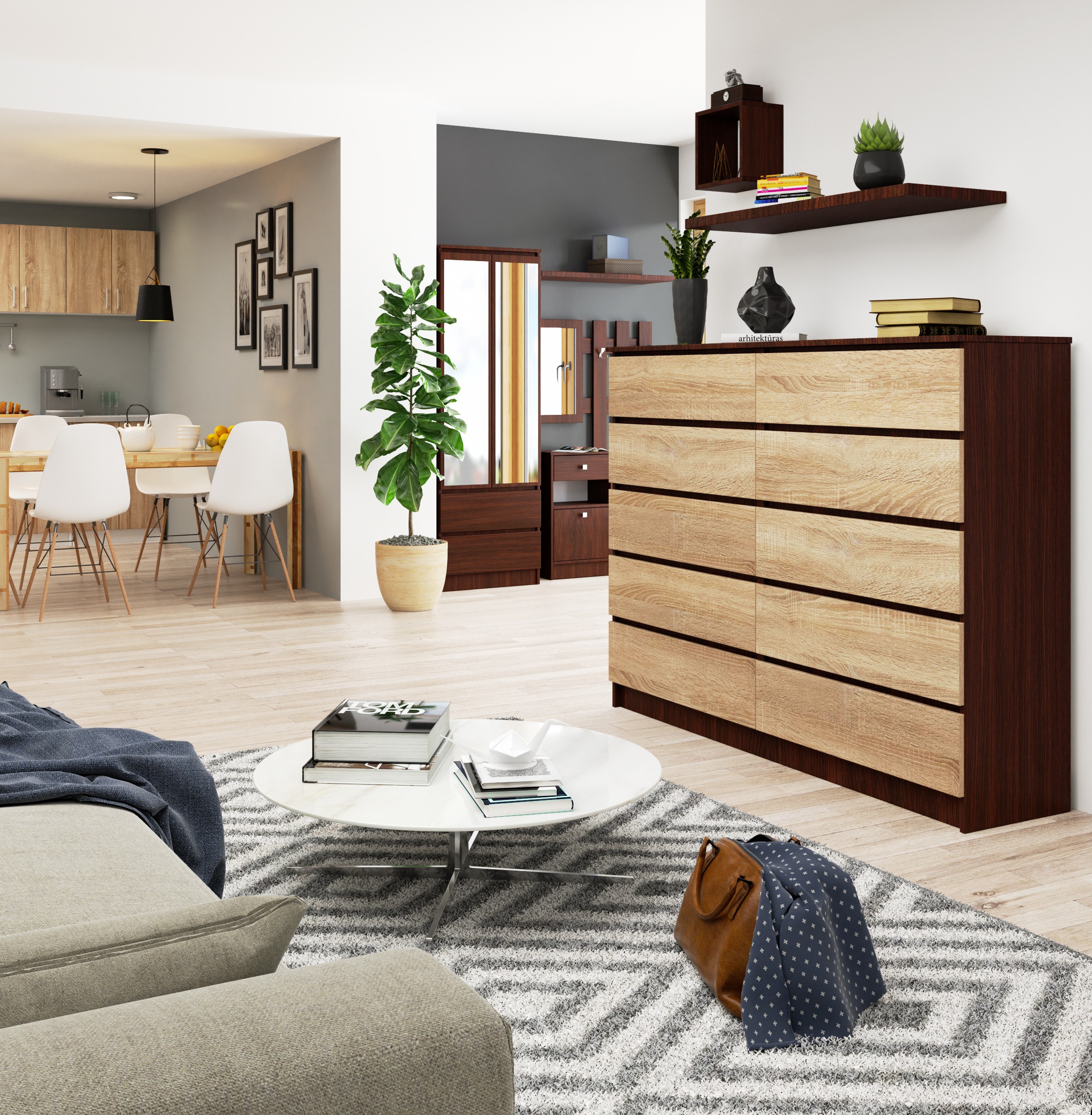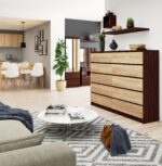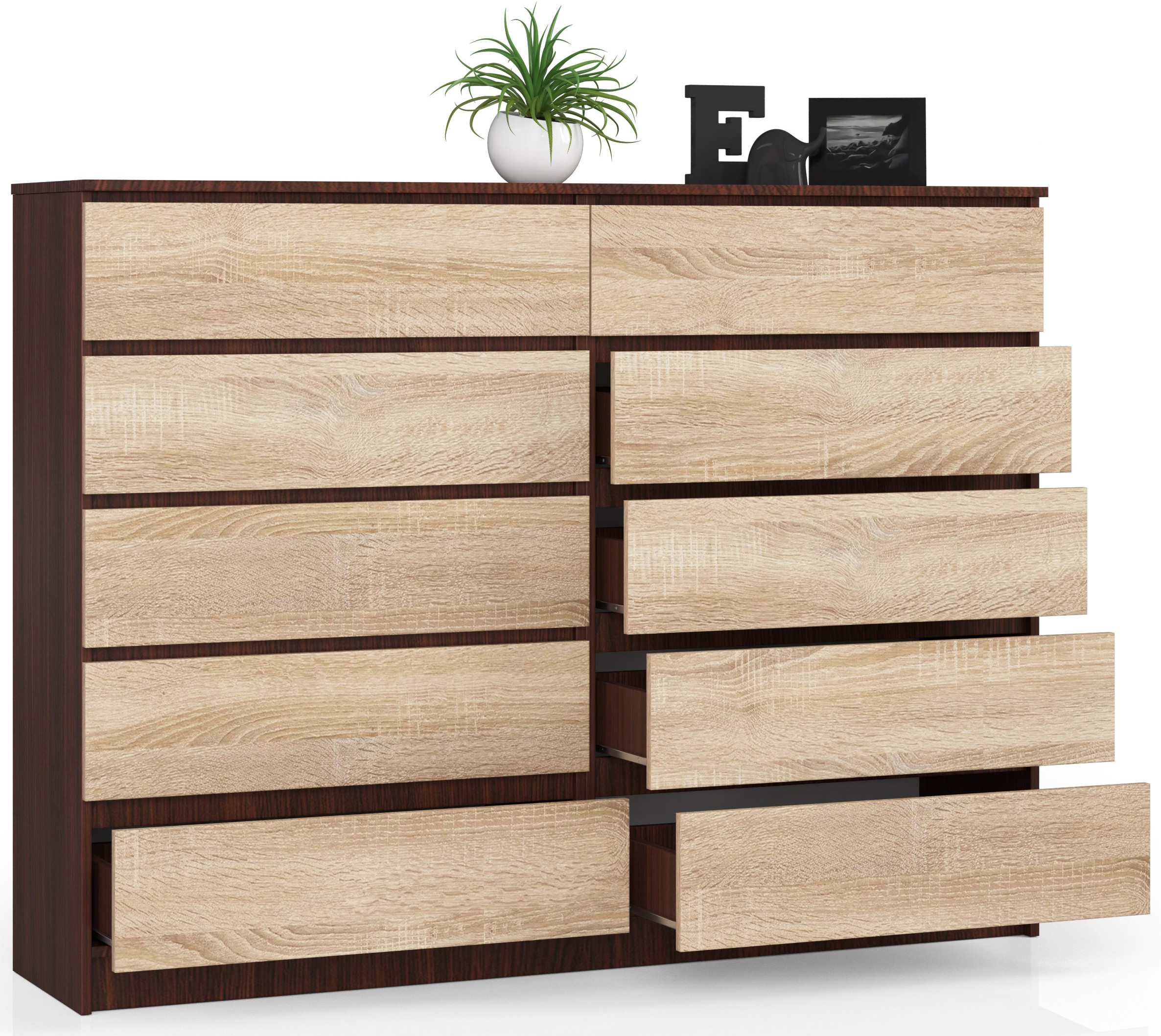 Komoda K, 160 × 121 × 40 cm, pagaminta iš 16 mm storio, atsparios dilimui laminuotos plokštės Wenge / Sonoma ąžuolo spalvos su natūraliu ir elegantišku charakteriu. Ši aukštos kokybės medžiaga buvo panaudota kuriant komodos viršų ir stalčių fasadus. Šis modelis puikiai dera interjere, dekoruotame pagal šiuolaikines tendencijas, o dviejų kontrastingų spalvų derinys suteikia įdomų ir estetinį efektą. Komoda yra CLP baldų sistemos elementas, į kurį taip pat įeina spintelės, lentynos ir rašomieji stalai, kuriuos galima derinti įvairiais deriniais. Įrengta Komeda K su 10 talpių ir funkcionalių stalčių, sumontuotų ant metalinių ritinėlių kreiptuvų. Dėl to jie juda tyliai ir lengvai, o naudotis jais patogu ir malonu. Stalčių išmatavimai suprojektuoti taip, kad būtų patogu ir praktiška laikyti drabužius ar kitus smulkius daiktus ar dokumentus. Šis baldas sveria 90 kg, yra reguliuojamas ir, nepaisant dydžio, neužima daug vietos. Siekiant užtikrinti apsaugą nuo mechaninių pažeidimų, visi kraštai yra padengti ABS apvadu, labai atsparia medžiaga, kurią naudoja geriausi baldų gamintojai. Komoda parduodama kaip savaiminio surinkimo komplektas, prie kurio pridedama labai aiški ir paprasta instrukcija lenkų kalba. Taigi su mūsų gaminio surinkimu gali susitvarkyti kiekvienas, net ir neturintis baldų surinkimo patirties. – Komoda iš trinčiai atsparios laminuotos plokštės – Stalčių fasadai iš laminuotos plokštės – Stalčiai eina ant metalinių ritinėlių kreiptuvų – Kraštai padengti ABS apvadu, užtikrinančiu aukštą apsaugą nuo pažeidimų – Savarankiškai surenkama komoda – Pridedamos instrukcijos – Garantija 24 mėn.