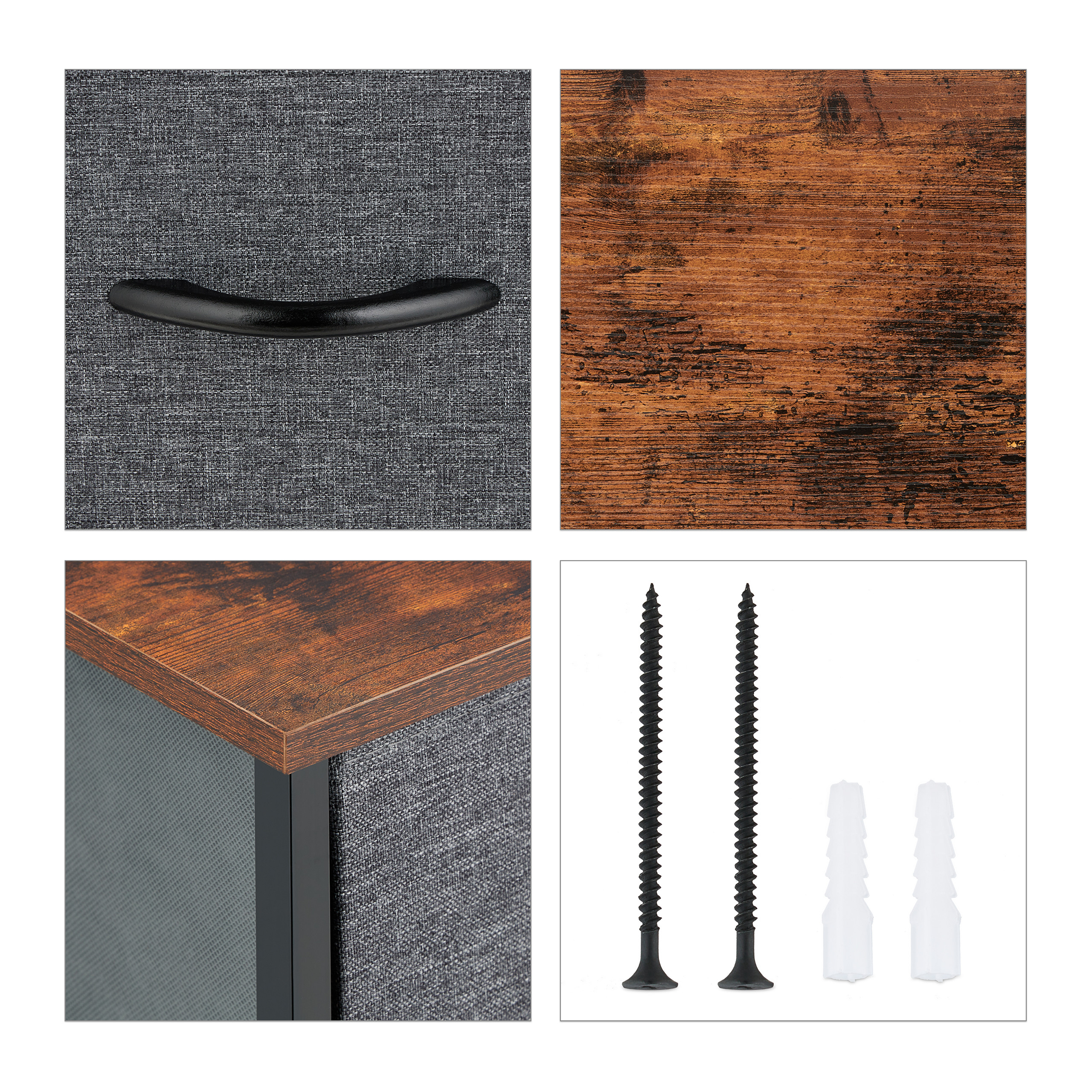 - Stilingas dizainas: Pilko audinio, tamsiai rudos medienos išvaizdos ir juodo metalinio rėmo derinys sukuria modernų ir elegantišką įspūdį.