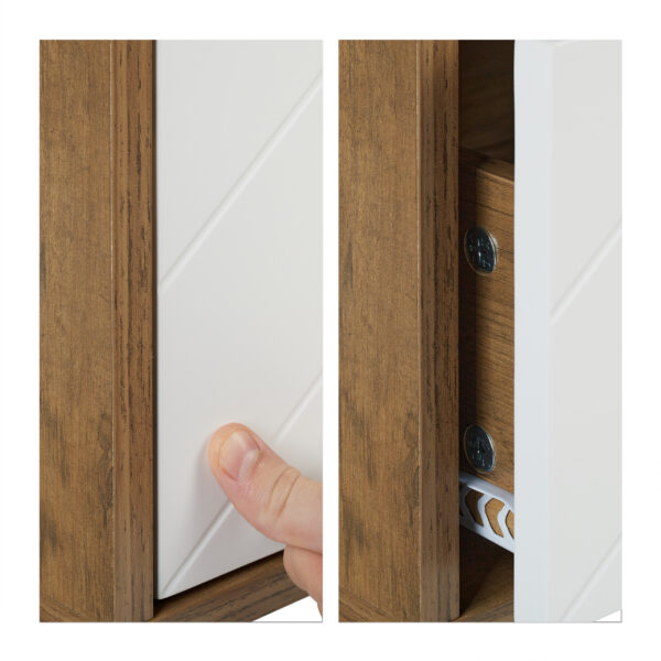 - Stilingas dizainas: Rudos medienos ir baltų priekinių dalių derinys sukuria šiuolaikišką ir elegantišką išvaizdą.