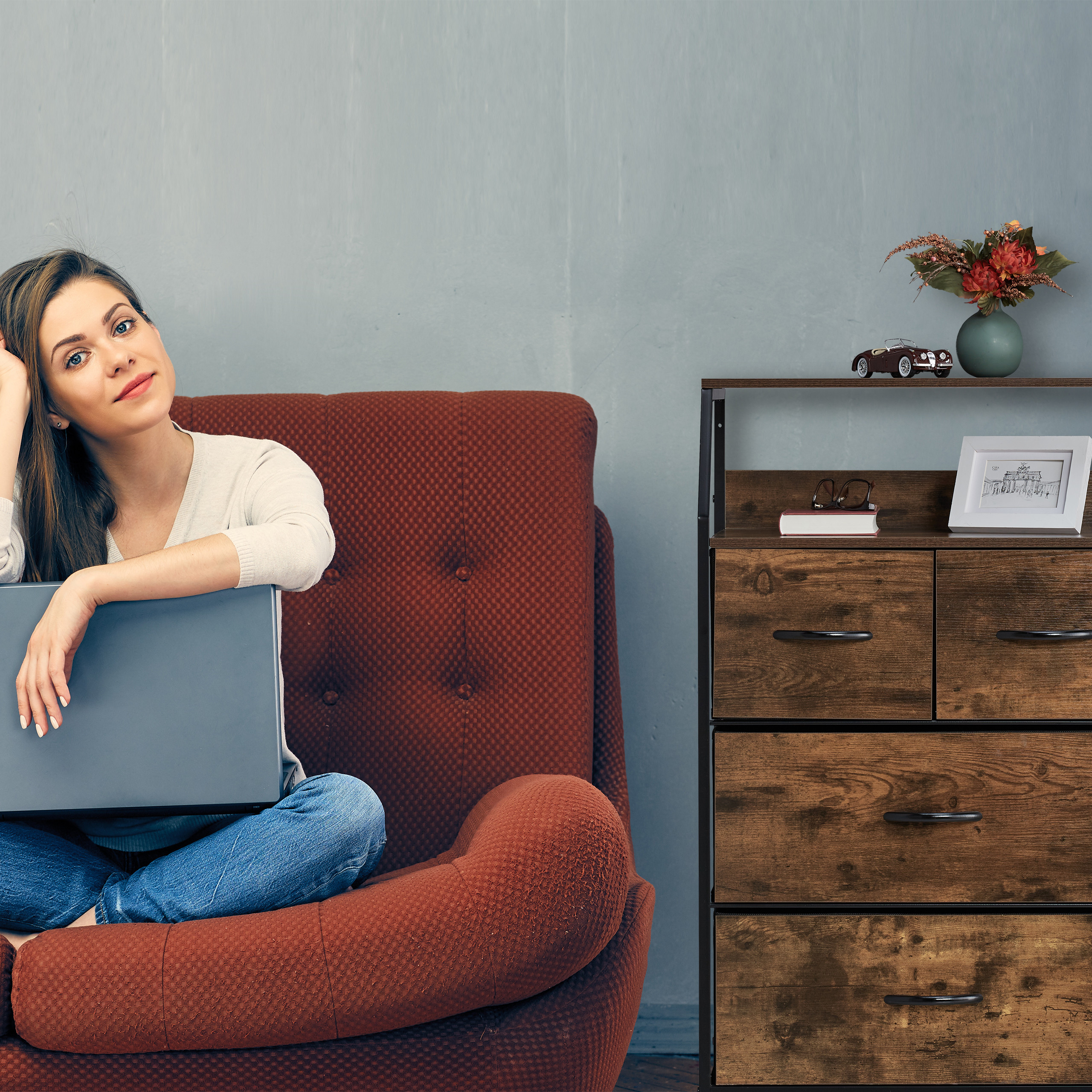 - Erdvūs stalčiai: Keturi talpūs stalčiai suteikia daug vietos drabužiams, šalikams, knygoms ir kitiems daiktams laikyti.