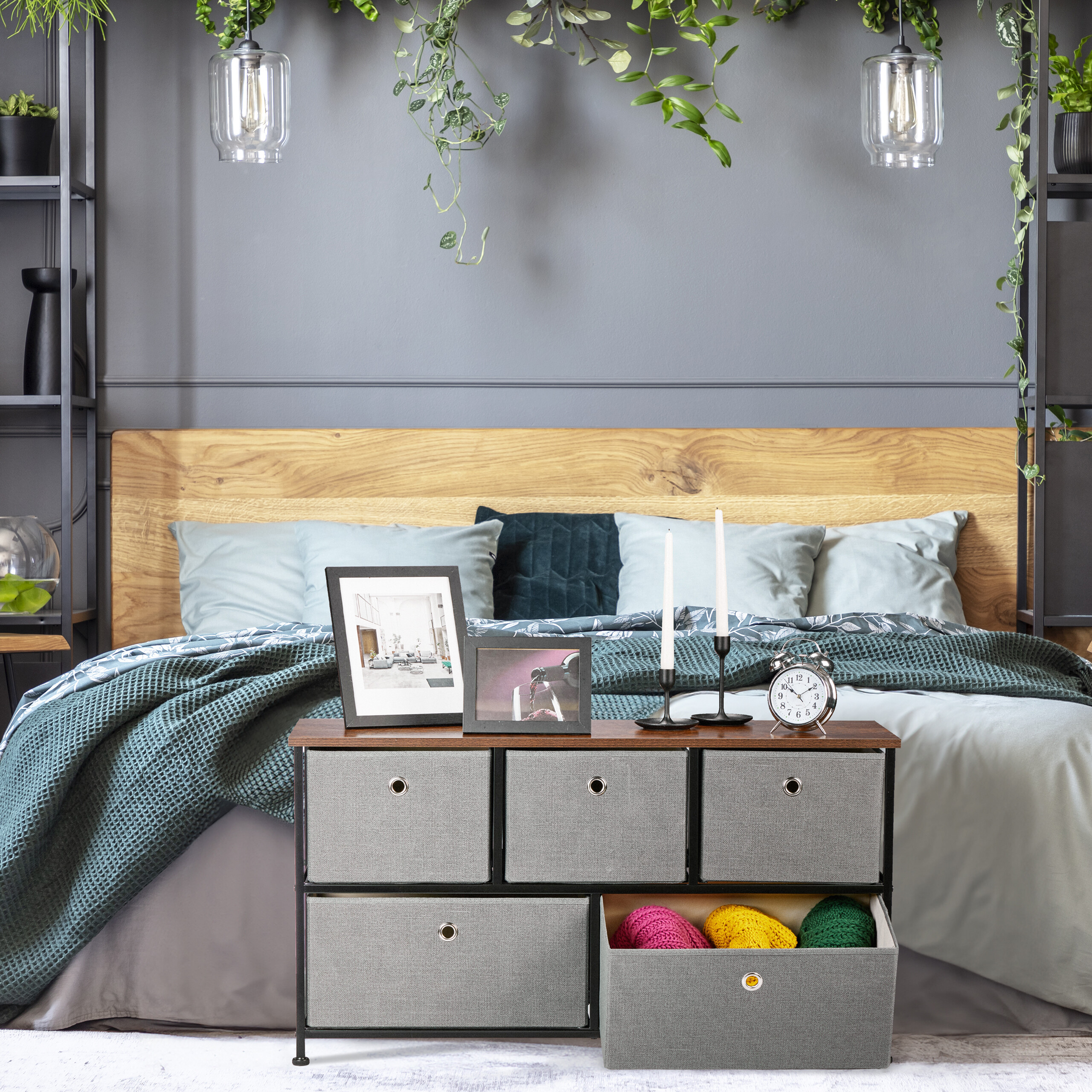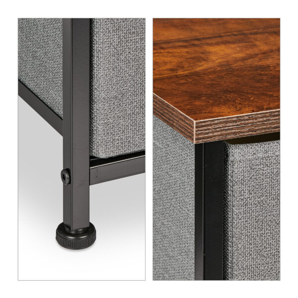 - Industrinis Dizainas: Rudos medienos išvaizda, juodas metalinis rėmas ir pilki audinio stalčiai sukuria stilingą ir modernų derinį.