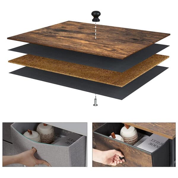 Daug dėmesio skirdami detalėms, nesijaudinkite, jei turite vaikų, nes šio naktinio staliuko dizainas yra patogus vaikams. Komplekte esantis apsaugas nuo virtimo užtikrina saugią aplinką jūsų šeimai, o medžiaginiai stalčiai neleidžia mažoms rankytėms įstrigti, kai jūsų mažyliai nori susidėti drabužius į stalčius patys. Tiesiog vadovaukitės lengvai vykdomomis instrukcijomis ir greitai paruošite šį šoninį stalą.