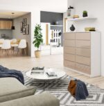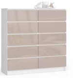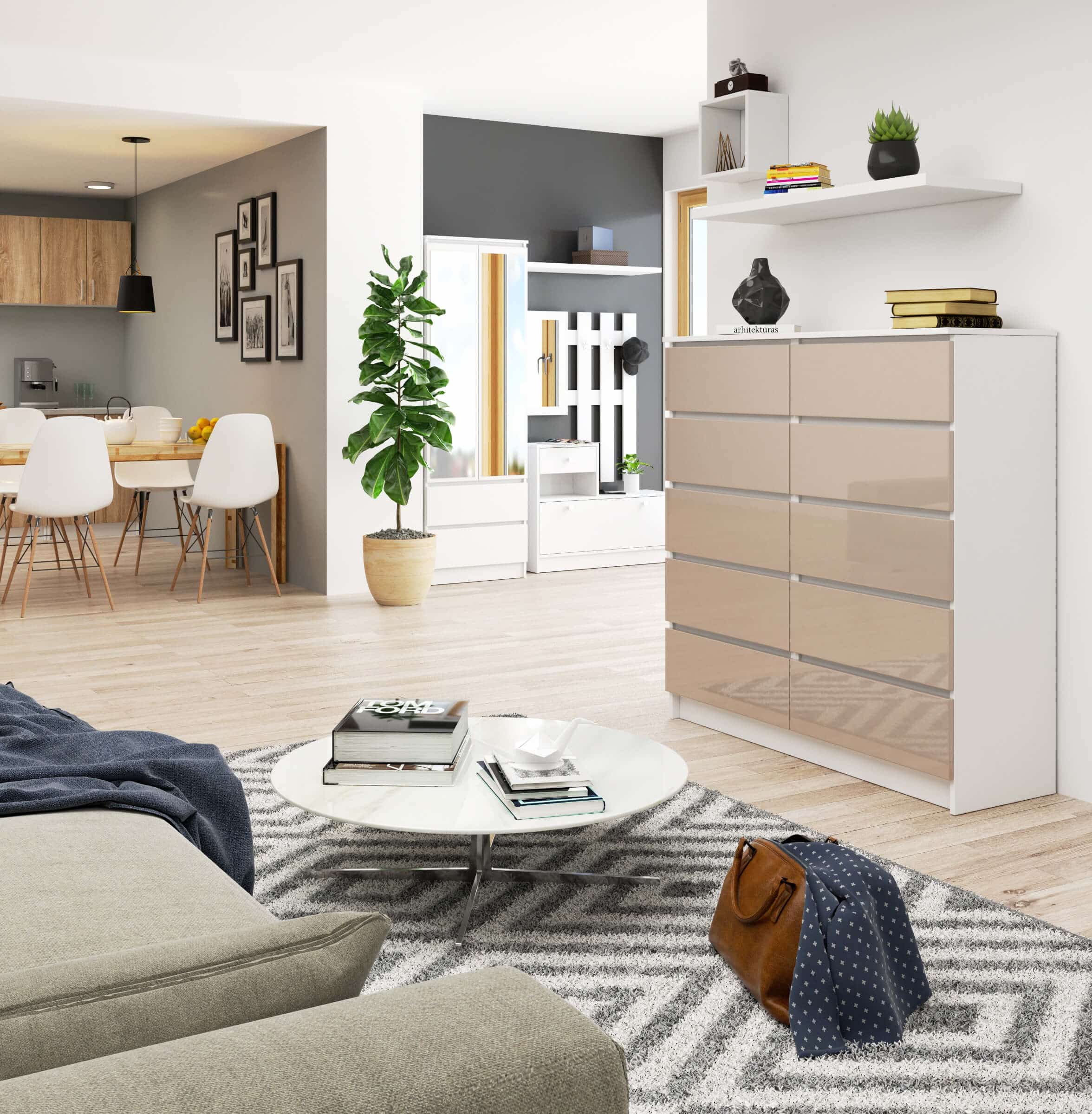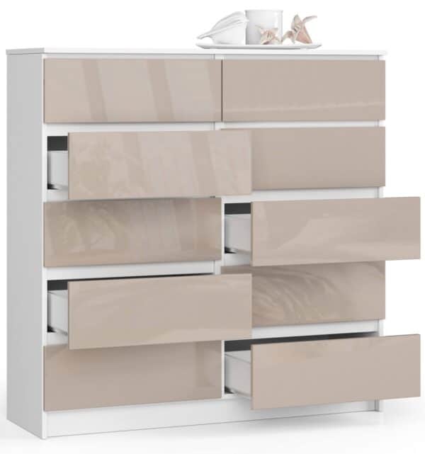 – Komodos korpusas pagamintas iš laminuotos plokštės balto kilimėlio, atsparus 16 mm dilimas – Priekinės dalys pagamintos iš akrilo MDF plokštės kapučino blizgesio – Stalčiai yra ant metalinių ritinėlių kreipiančiųjų – Kraštai padengti ABS briauna, kad būtų gerai apsaugota nuo pažeidimų – Savaime surenkama dėžė stalčiai – Pristatymo instrukcijos – Garantija 24 mėn.