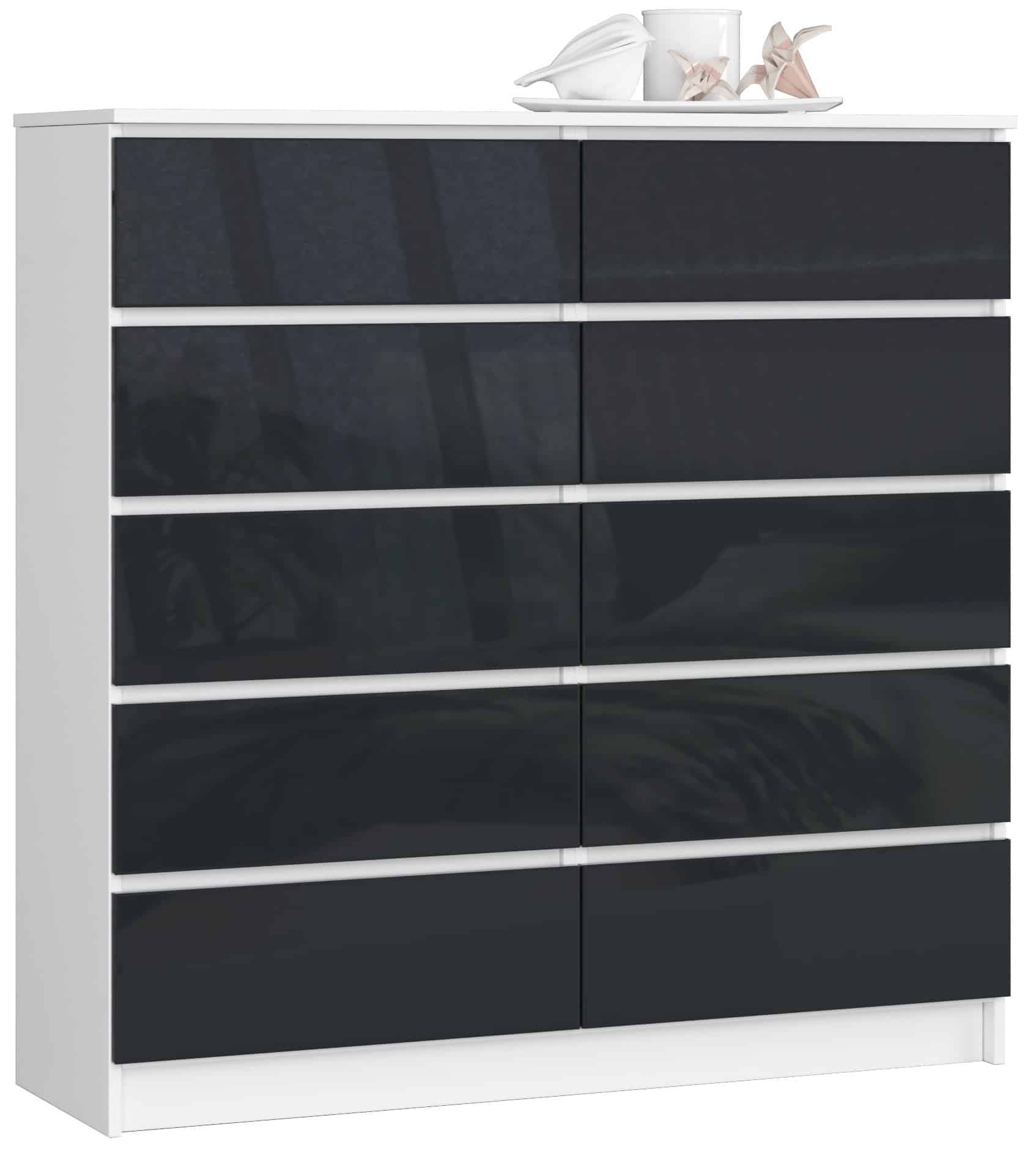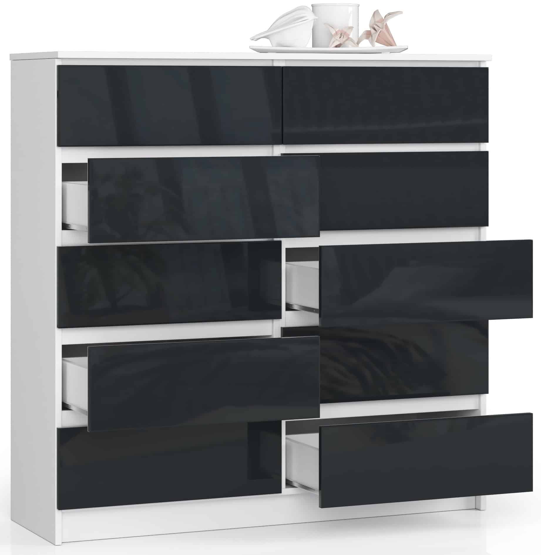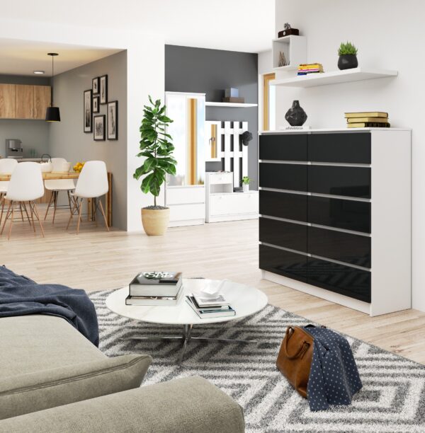 Komoda K 120 cm išsiskiria nepaprastu spalvų deriniu. Baldų fasadai pagaminti iš blizgaus grafito ir derinami su baltu korpuso kilimėliu. Matinis ir blizgus – labai įdomus sprendimas, o kartu ir itin universalus. Dėl to baldų stilius dera prie įvairių išdėstymų, pvz., glamūrinis ir Niujorko stilius, vertinantis blizgesį ir blizgančius paviršius, arba minimalistinis ir modernus išdėstymas. Komoda yra labai funkcionalus ir patvarus baldas, o tai yra didelis jo privalumas. Turi net 10 itin erdvių stalčių, kuriuose galima sutalpinti didelį kiekį drabužių, apatinių, kasdienių daiktų, dokumentų ar aksesuarų iš siuvėjo dirbtuvių. Komoda gali būti naudojama visur, kur norite palaikyti tobulą tvarką. Ją galima patalpinti svetainėje, miegamajame, namų ir įmonės studijoje, biure ir jaunimo kambaryje. Neabejotini komodos privalumai – didelis jos patogumas. Toks baldas tikrai pravers kiekvienuose namuose, bute ir įmonėje. Papildomas, didelis privalumas – dizaineriška išvaizda. – Komodos korpusas pagamintas iš laminuotos plokštės balto kilimėlio 16mm atsparus dilimui – Fasadai iš MDF plokštės AKRYL grafito blizgesys – Stalčiai yra ant metalinių ritinėlių kreiptuvų. – Kraštai padengti ABS briauna, užtikrinančia aukštą apsaugą nuo pažeidimų. – Savaime surenkama dėžė stalčių – Pristatyme pateikiamos instrukcijos – 24 mėnesių garantija