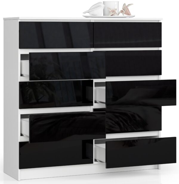 – Komodos korpusas pagamintas iš laminuotos plokštės balto kilimėlio, atsparus 16 mm dilimas – Priekinės dalys pagamintos iš akrilo MDF plokštės, blizgios juodos spalvos – Stalčiai eina ant metalinių ritinėlių – Kraštai padengti ABS briauna, užtikrinančia aukštą apsaugą nuo pažeidimų – Savarankiškai surenkama komoda – Pristatymo instrukcijos – Garantija 24 mėn.