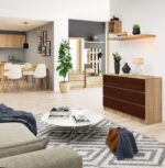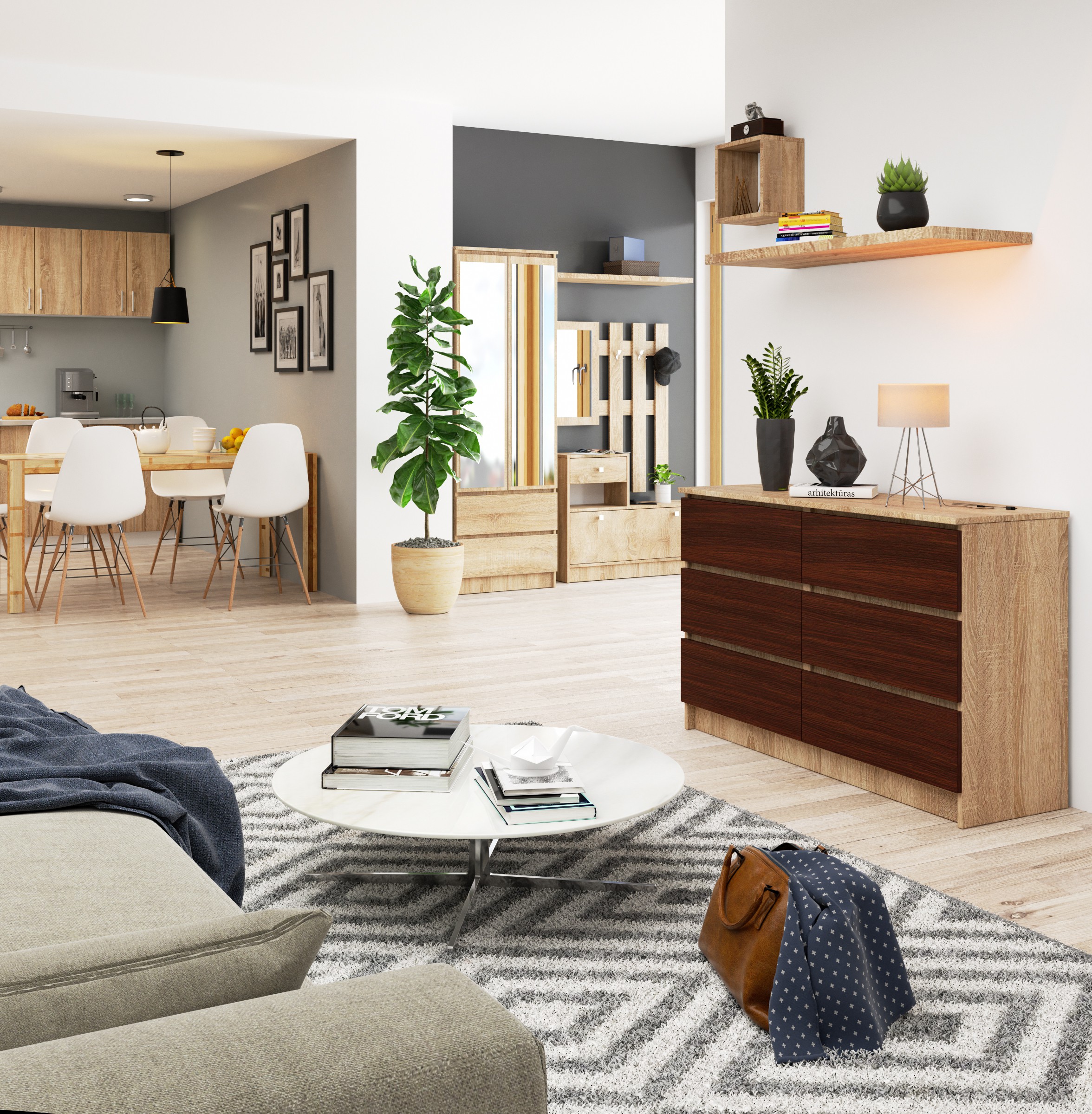 – Komoda iš dilimui atsparios laminuotos plokštės – Stalčių fasadai pagaminti iš laminuotos plokštės – Stalčiai yra ant metalinių ritinėlių kreipiančiųjų – Kraštai padengti ABS briauna, užtikrinančia aukštą apsaugą nuo pažeidimų – Savarankiškai surenkama komoda – Pristatymo vadovas – Garantija 24 mėn.