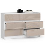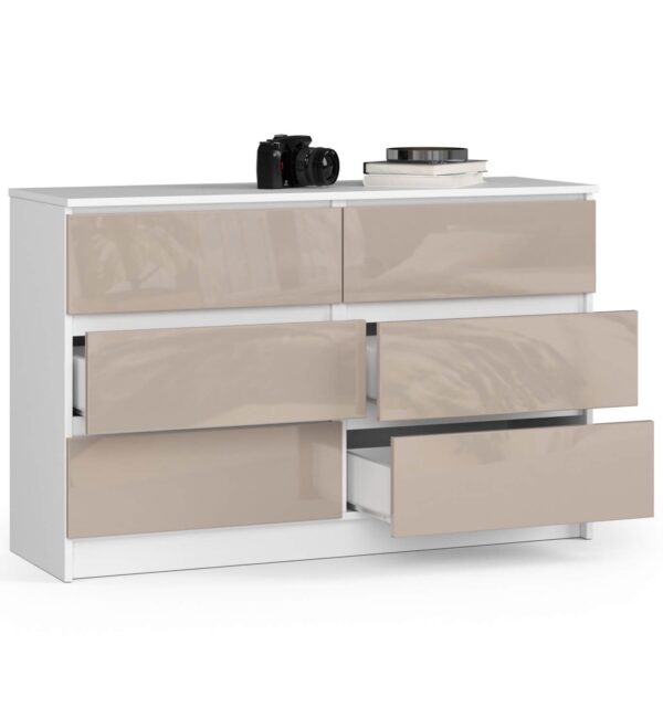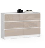 – Komodos korpusas pagamintas iš laminuotos plokštės balto kilimėlio, atsparus dilimui 16 mm – Priekiniai skydai pagaminti iš 19 mm AKRYL plokštės su CAPPUCCINO blizgiu dekoru – Stalčiai juda ant metalinių ritinėlių kreiptuvų – Kraštai padengti ABS briauna, užtikrinančia aukštą apsaugą nuo pažeidimų – Savarankiškai surenkama komoda – Pristatyme pateikiamos instrukcijos – 24 mėnesių garantija