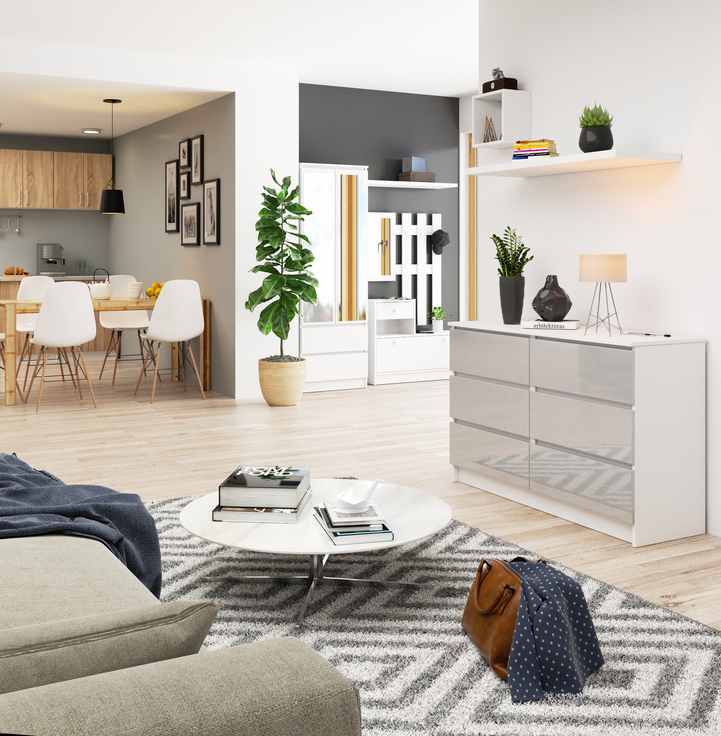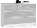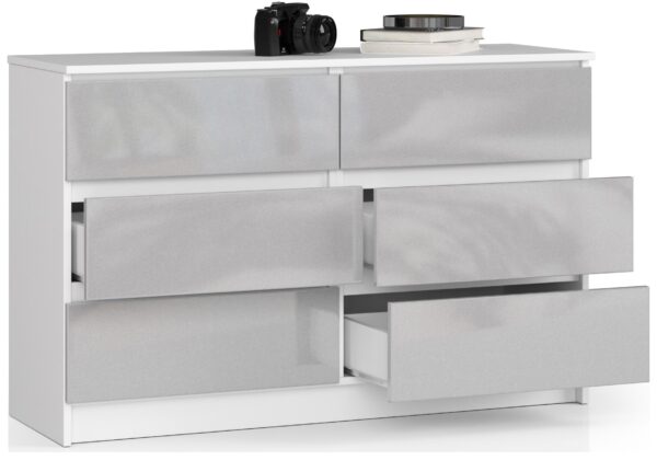 – Komodos korpusas pagamintas iš laminuotos plokštės balto kilimėlio, atsparus dilimui 16 mm – Priekiniai skydai pagaminti iš 19 mm AKRYL plokštės su blizgiu metaliniu dekoru – Stalčiai juda ant metalinių ritinėlių kreiptuvų – Kraštai padengti ABS briauna, užtikrinančia aukštą apsaugą nuo pažeidimų – Savarankiškai surenkama komoda – Pristatyme pateikiamos instrukcijos – 24 mėnesių garantija