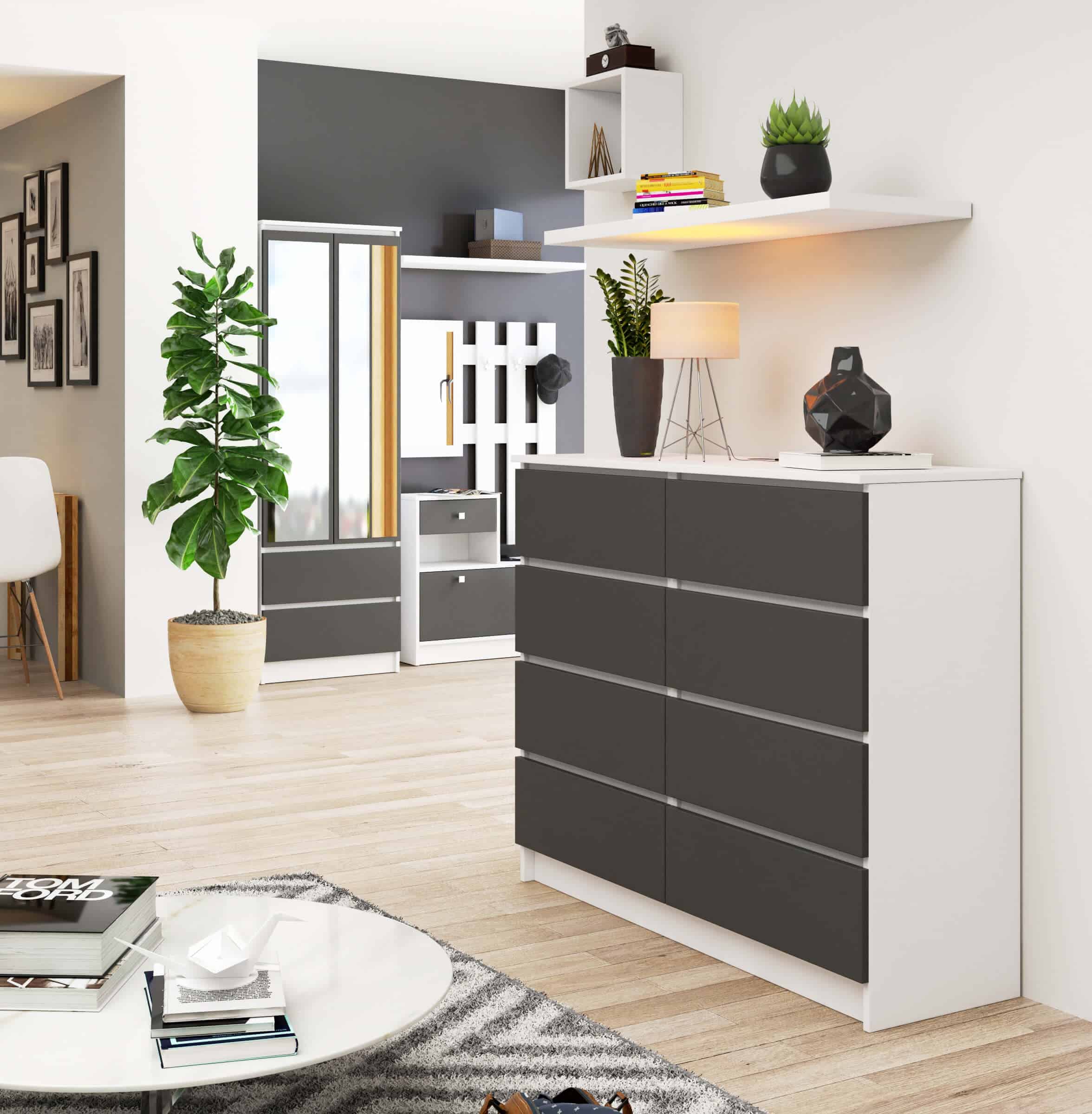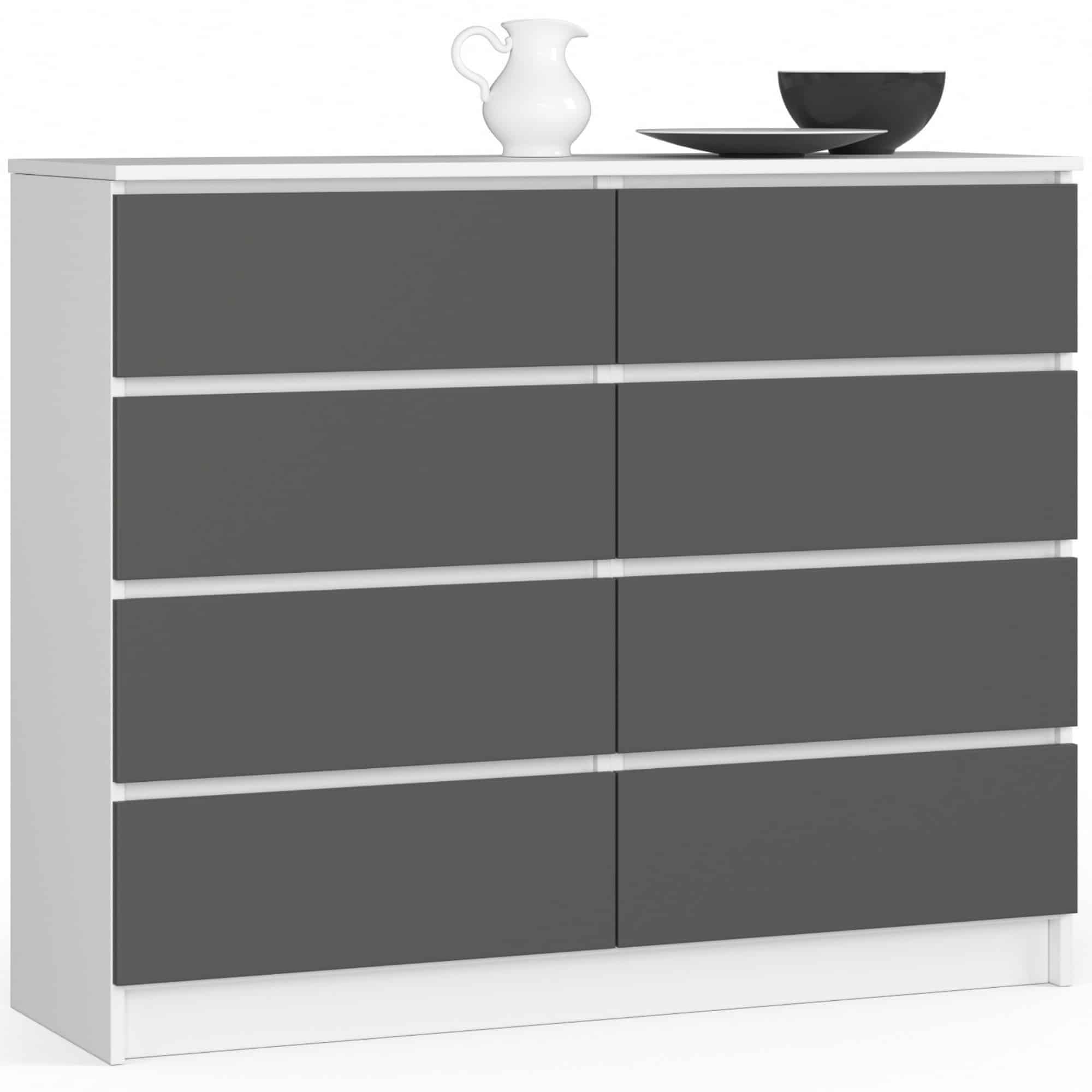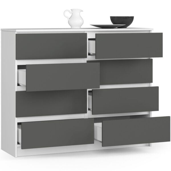 Komoda NORE K120 su 8-iais stalčiais, baltos/pilkos spalvos