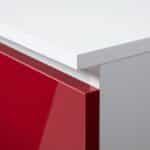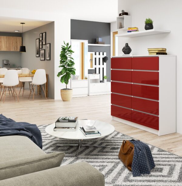 Komoda, modelis K – tai išskirtinės, energingos spalvos baldas. Giliai raudona blizgių priekinių dalių spalva ir balta matinė korpuso apdaila atrodo labai intriguojančiai. Įspūdį sustiprina blizgi struktūra, atspindinti šviesą ir sukurianti efektyvius atspindžius ant baldų paviršiaus. Net 10 stalčių leidžia valdyti didelį kiekį savo drabužių spintos ir kitų namų priedai. Stalčiai leidžia patogiai laikyti ir išlaikyti juos nepriekaištingą tvarką. Tai labai funkcionalus gaminys, kuris yra labai patvarus. Joje galima laikyti ir sunkesnius daiktus. Baltos/raudonos spalvos blizgus komoda – tai baldas, kuris puikiai atrodė baltos, tamsiai mėlynos, pilkos ir kapučino spalvų fone, tačiau kuo daugiau drąsūs gali derinti jį su energingu buteliuku oranžinės žalios arba sodrios violetinės spalvos. Baldas puikiai tiks tiek svetainei, tiek siuvėjų ir rankdarbių dirbtuvėms, tiek šiuolaikiškiems biurams, dekoruotas drąsiai su letena. Galima sėkmingai integruoti ir į klasikines kompozicijas. – Komodos korpusas pagamintas iš laminuotos plokštės balto kilimėlio 16mm atsparus trinčiai – Priekinės dalys iš MDF akrilo raudonos blizgesys – Stalčiai juda ant metalinių ritinėlių kreiptuvų – Kraštai padengti ABS briauna, kad būtų apsaugota nuo pažeidimų. – Savaime surenkama komoda stalčiai – Pristatymo instrukcijos – 24 mėnesių garantija