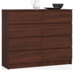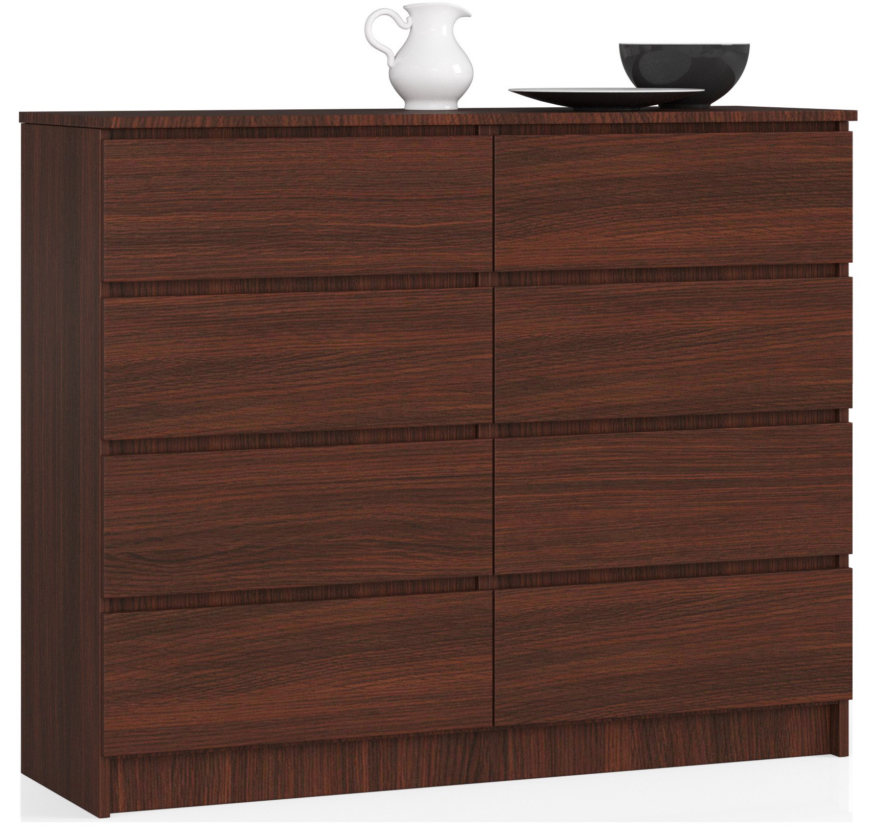 CHEST K120 yra aukštos kokybės baldas, susidedantis iš aštuonių erdvių stalčių. Išlaikytas nesenstančia wenge spalva, pasiūlymas puikiai tinka tiek moderniam, tiek klasikinio grožio interjerui. Baldai bus naudojami daugelyje gyvenamųjų patalpų – svetainėse, miegamuosiuose, valgomuosiuose, namų biuruose ar jaunimo kambariuose. Jis taip pat puikiai tiks viešbučio kambariuose ir biurų interjeruose, todėl galėsite laikyti reikalingus priedus. Gaminys pagamintas iš geros kokybės medžiagų, kurių dėka pasižymi ilgaamžiškumu, tvirtumu ir atsparumu pažeidimams. Funkcinį pasiūlymą tikrai įvertins net reikliausi klientai, kurie daugiausia dėmesio skiria paprastumui ir elegancijai. – Komoda iš dilimui atsparios laminuotos plokštės > – Stalčių fasadai pagaminti iš laminuotos plokštės – Stalčiai yra ant metalinių ritinėlių kreiptuvų – Kraštai padengti ABS briauna, užtikrinančia aukštą apsaugą nuo pažeidimų – Komoda, skirta savarankiškai surinkti – Instrukcija pridedama – Garantija 24 mėn.
