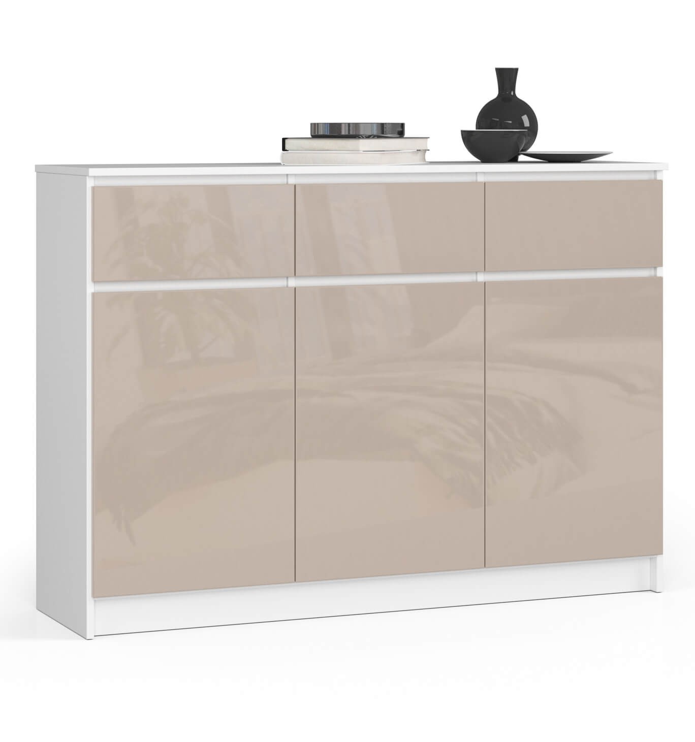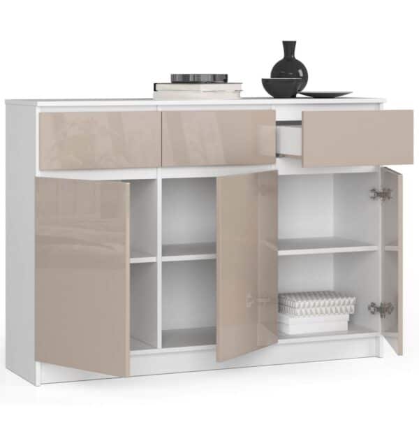 Komoda iš aukštos kokybės 16 mm laminuotos plokštės, atsparios dilimui. Kompaktinį diską pateikia gamintojas Kronospan Stalčių fasadai pagaminti iš laminuotos plokštės Stalčiai veikia ant metalinių slydimo ritinėlių Kraštai padengti ABS apvadu, kad būtų gerai apsaugoti nuo pažeidimų Kiekvieno viduje durys yra viena lentyna Savarankiškai surenkama komoda Instrukcijos pridedamos 24 mėnesių garantija